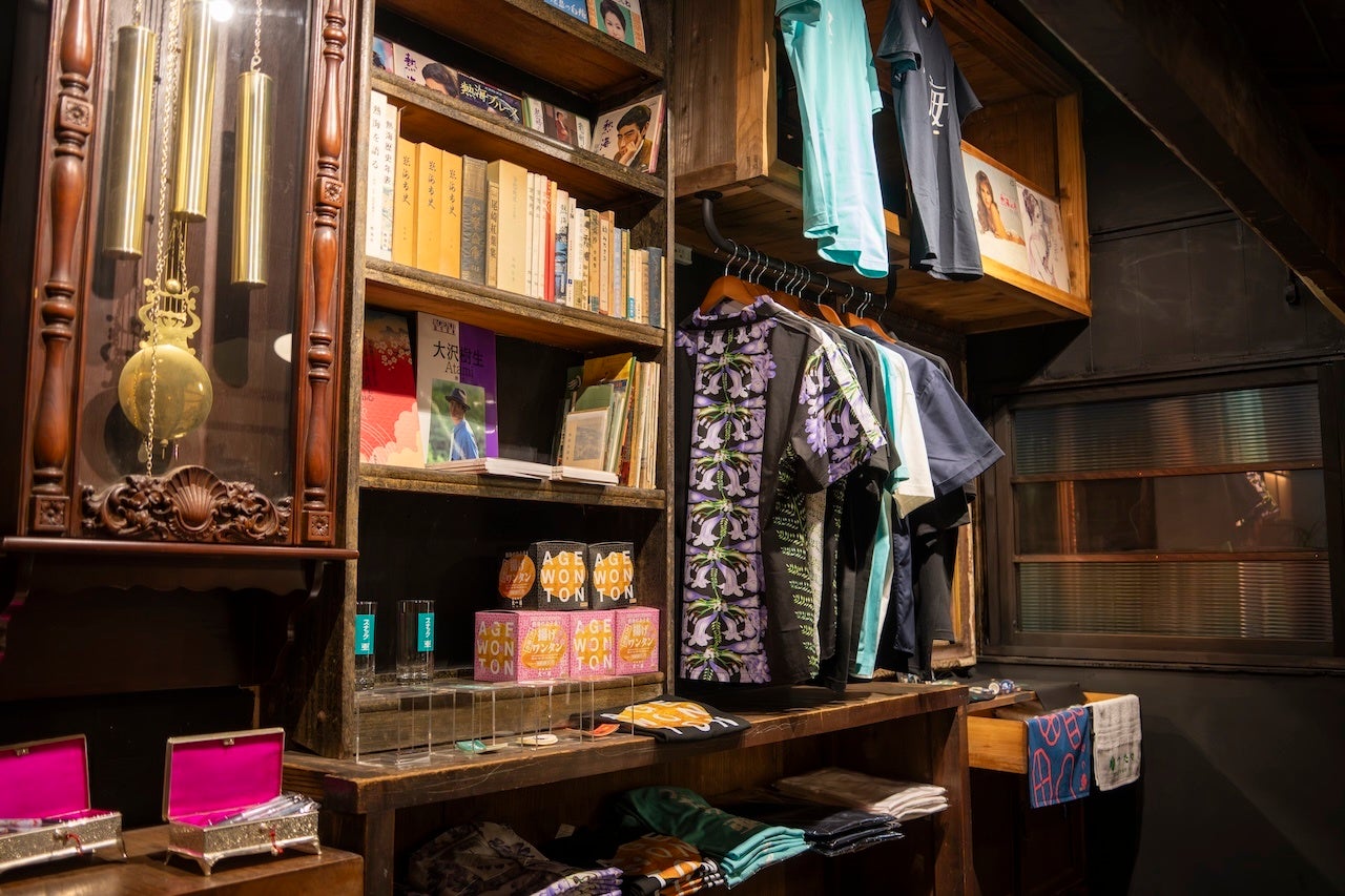 『ヨルノアタミ』は、街に灯りがともり始める頃から開く”夜の雑貨店”です。閑散としていることも多い熱海の夜の街に人を呼び込み、活性化することを目指してオープンしました。『旧つたや』に残る蔦の葉マークや透かし窓などの意匠を取り入れたTシャツ、トートバッグ、手ぬぐい、マスキングテープといったオリジナルのアパレル・雑貨を販売するほか、近隣の老舗飲食店やスナックのオリジナルグッズ、熱海の昔の土産品などの古物、遊郭や夜の街の文化に関連した書籍なども取り扱っています。また、熱海に関する書籍・雑誌・パンフレットなどを閲覧できる資料室、近隣店舗を紹介する街の案内所としての機能も担います。
