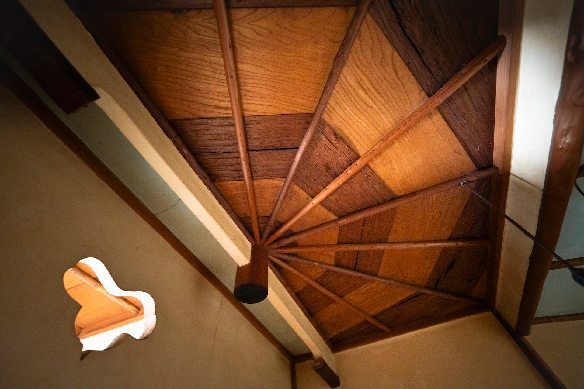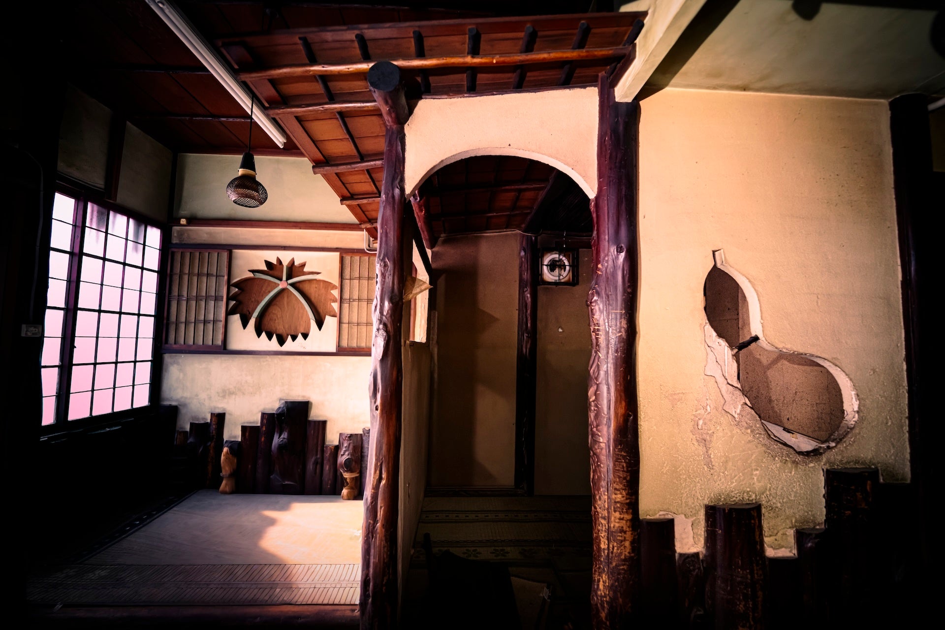『旧つたや』がある中央町周辺は、かつて「糸川花街」と呼ばれた色街でした。現在はスナックや居酒屋が立ち並ぶエリアとなっていますが、いまも妓楼建築やカフェー建築と言われる建物が残っており、独特のまち並みを形作っています。『旧つたや』は、その中でも最も規模が大きい建物です。雨漏りや外壁の崩落など傷みはありますが、比較的保存状態が良く、和洋折衷の外観や、蔦の葉や瓢箪をモチーフにした透かし窓などの意匠、数寄屋造りを思わせる天井や廊下の装飾が残っています。1階には、飲食スペースとして使われていた2つの部屋があり、2階には「梅」、「松」、「蔦」などの名前が付けられた8つの小部屋があり、それぞれ趣向を凝らした内装に仕上げられています。
