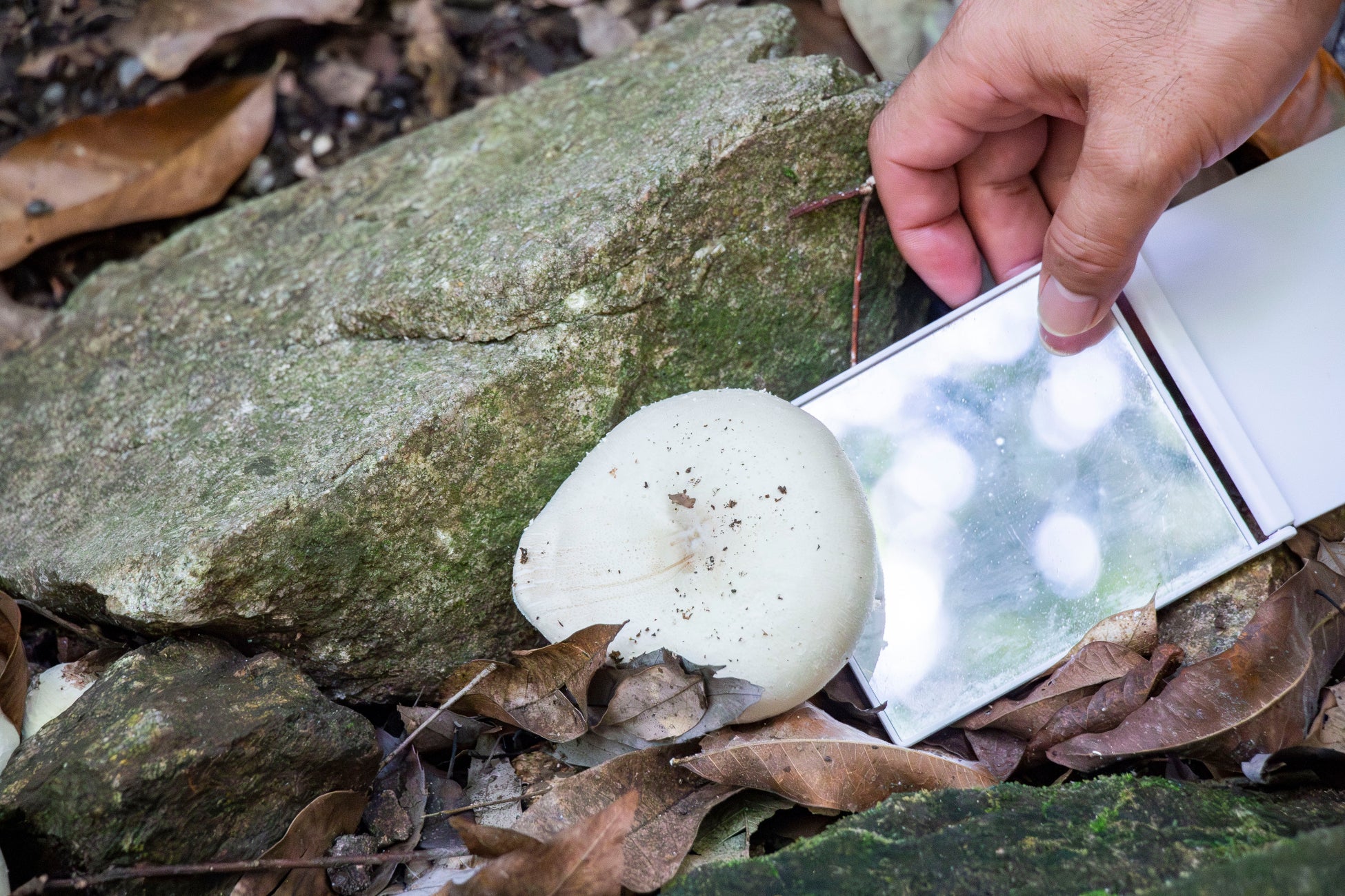「キノコが生えていますね、ちょっと裏側を見てみましょうか。採取してはいけないので、鏡を使って……」。