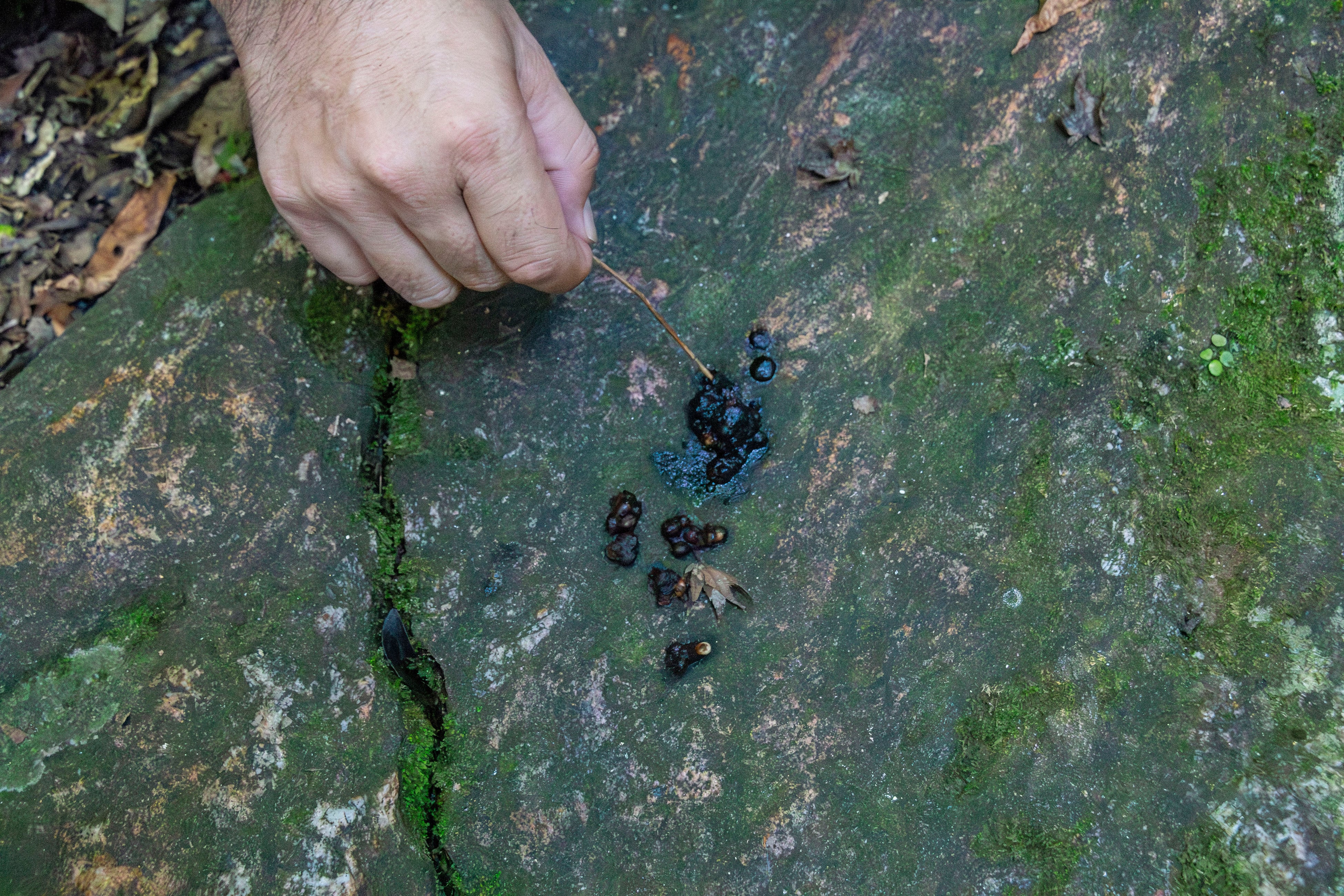 「キノコが生えていますね、ちょっと裏側を見てみましょうか。採取してはいけないので、鏡を使って……」。