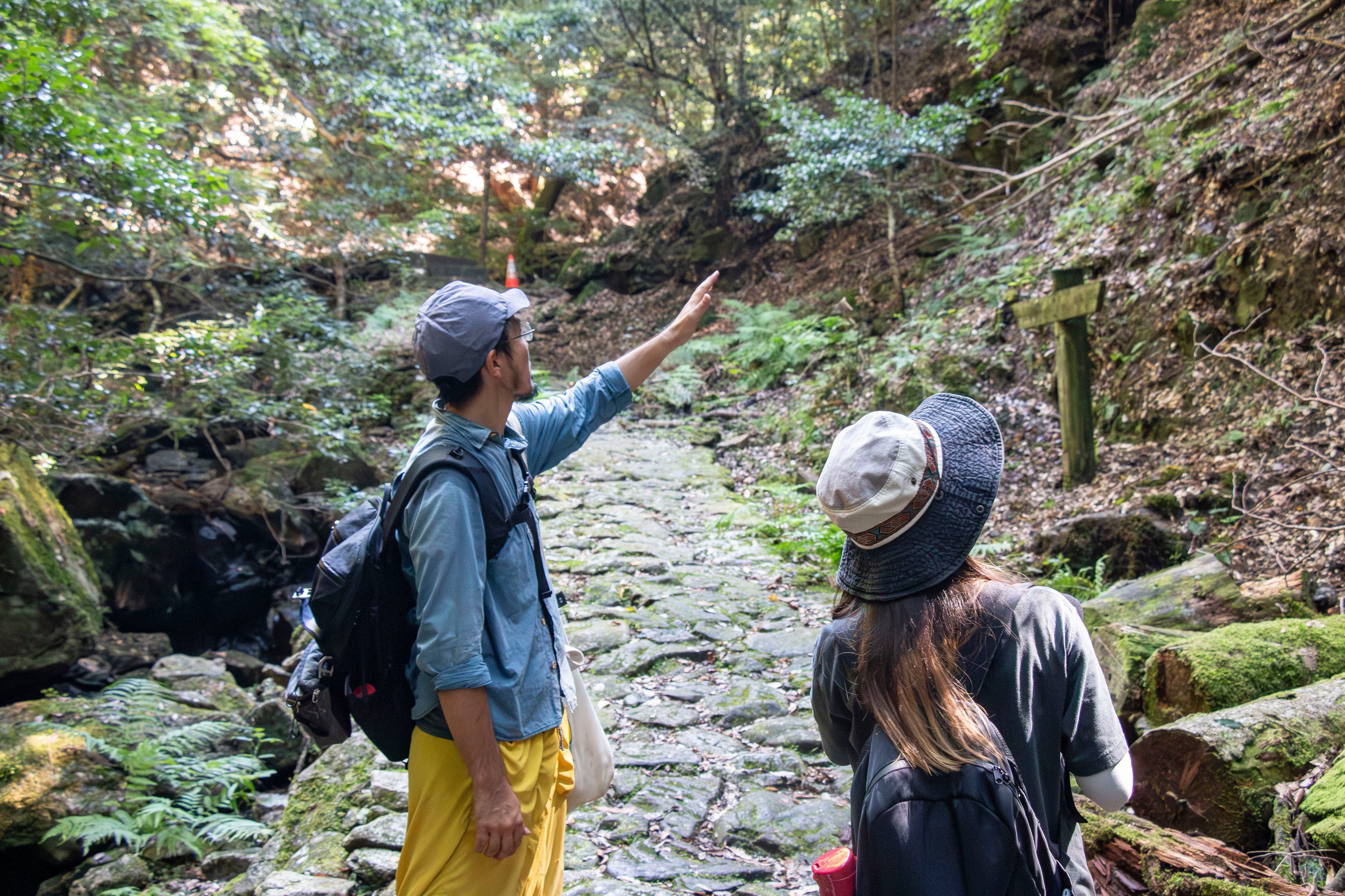 このガイドウォークで歩くのは、「滝坂の道(旧柳生街道)・南部遊歩道」と呼ばれるコース。ガイドとともに、江戸時代に奈良奉行のため敷かれた石畳の道や、山岳仏教の信仰対象とされていた石仏などの史跡を巡りつつ、春日山と高円山の谷あいを歩きます。