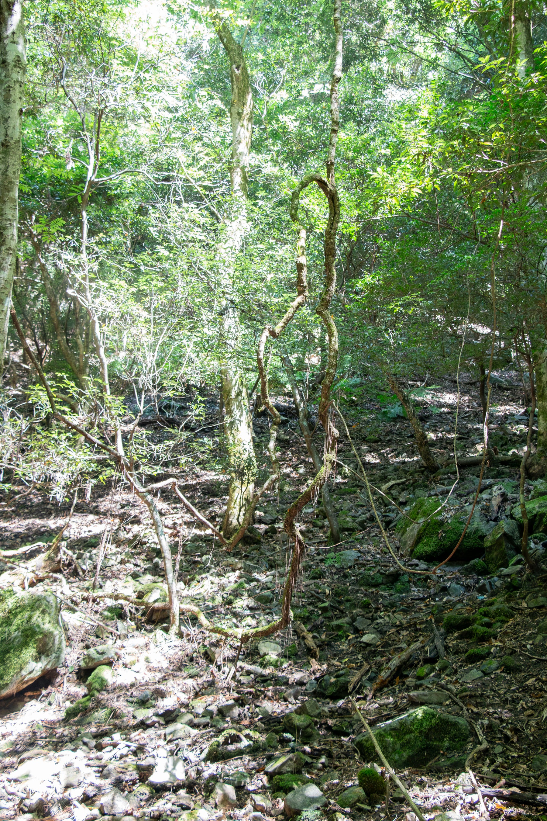 「あそこの木にツルが巻きついていますよね。あれは県の絶滅危惧種に指定されているウドカズラです。人の手で管理されている森だと切られてしまいますが、伐採が禁じられてきた春日山原始林では巻きつき放題。彼らにとって、ここはパラダイスなんです」。