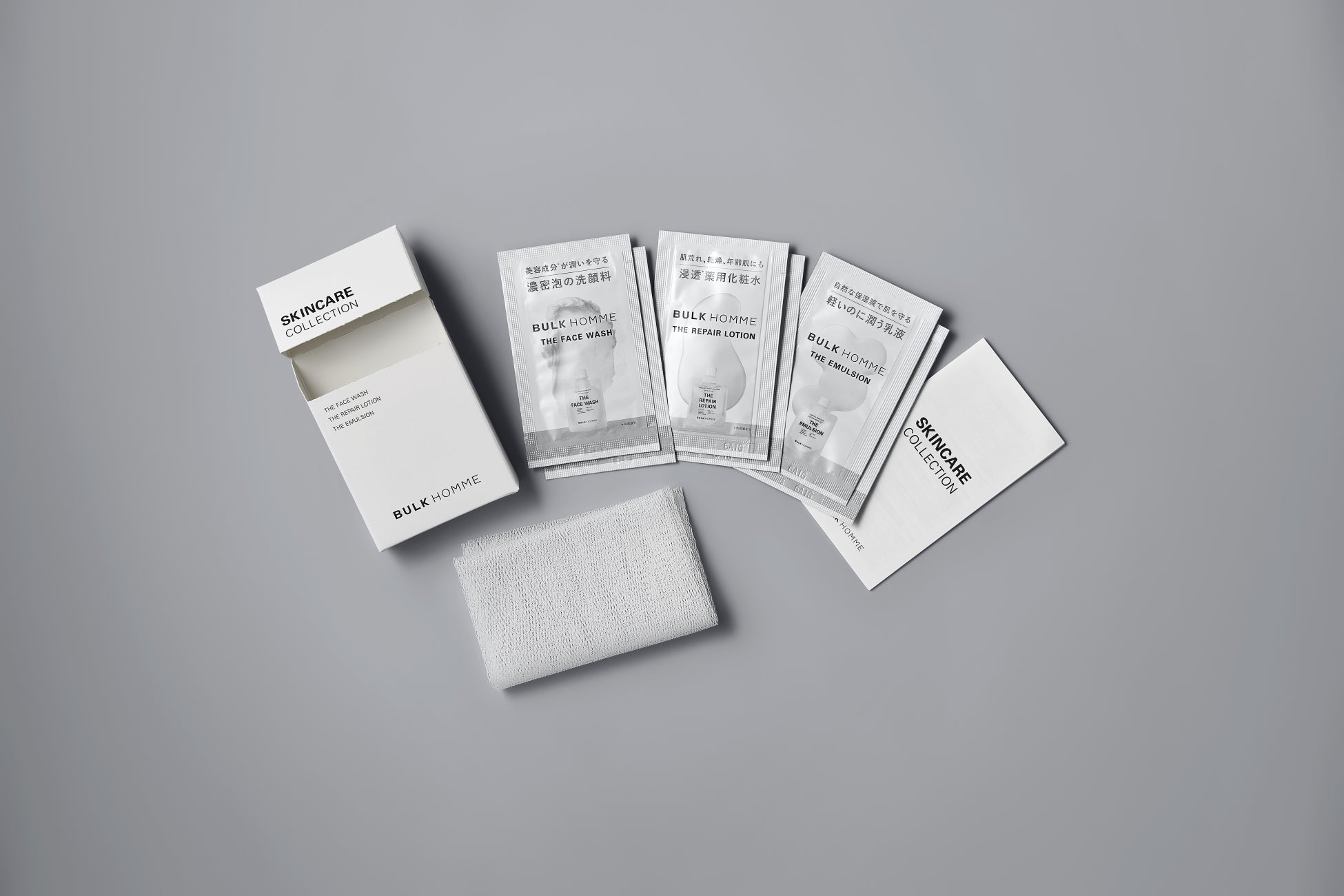 朝・夜の使用で1日分のスキンケアを1箱にパッケージ。紫外線や乾燥で乾いた肌をしっかりケアします。日本語、英語、中国語のHOW TO BOOK付き。