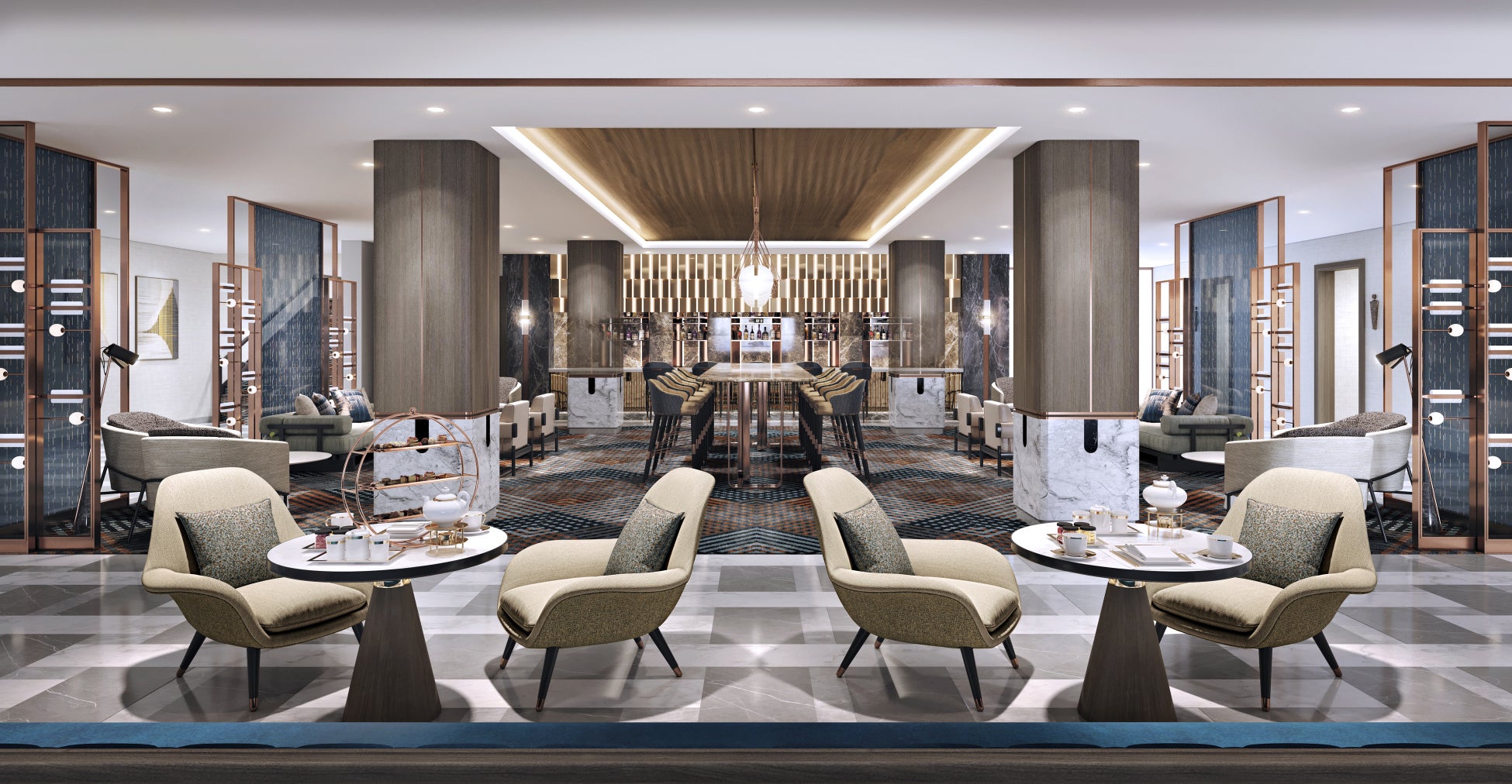客室やパブリックスペースには、織物の美しい質感を思わせる上質な素材が重なり合うデザインを