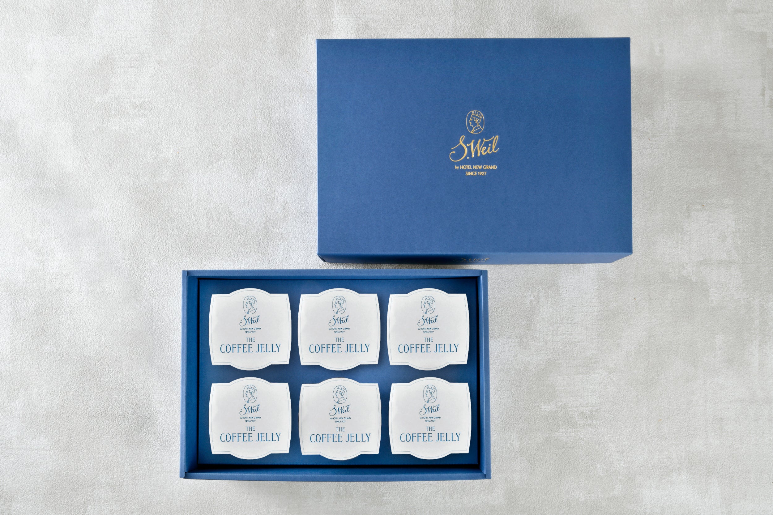 おしゃれなパッケージのコーヒーゼリーを、ニューグランドブルーのギフトボックスに入れてご用意しました。お中元や帰省のお土産として、遠くにいる大切な方にも、S.Weil by HOTEL NEW GRANDの味をお楽しみいただけるギフトセットです。