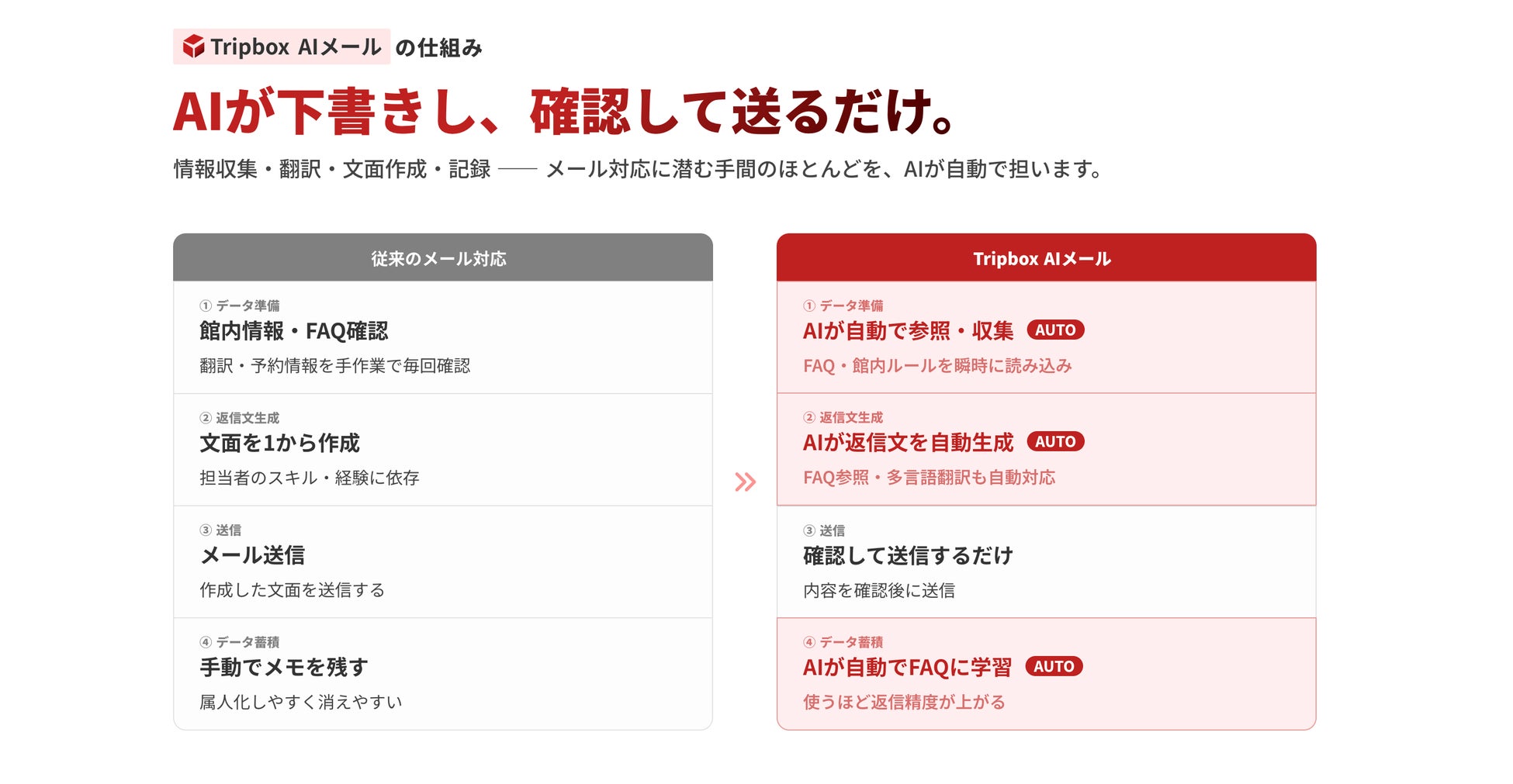 Tripboxサービスサイトより、従来のメール対応と「Tripbox AIメール」を活用したメール対応の差分の説明