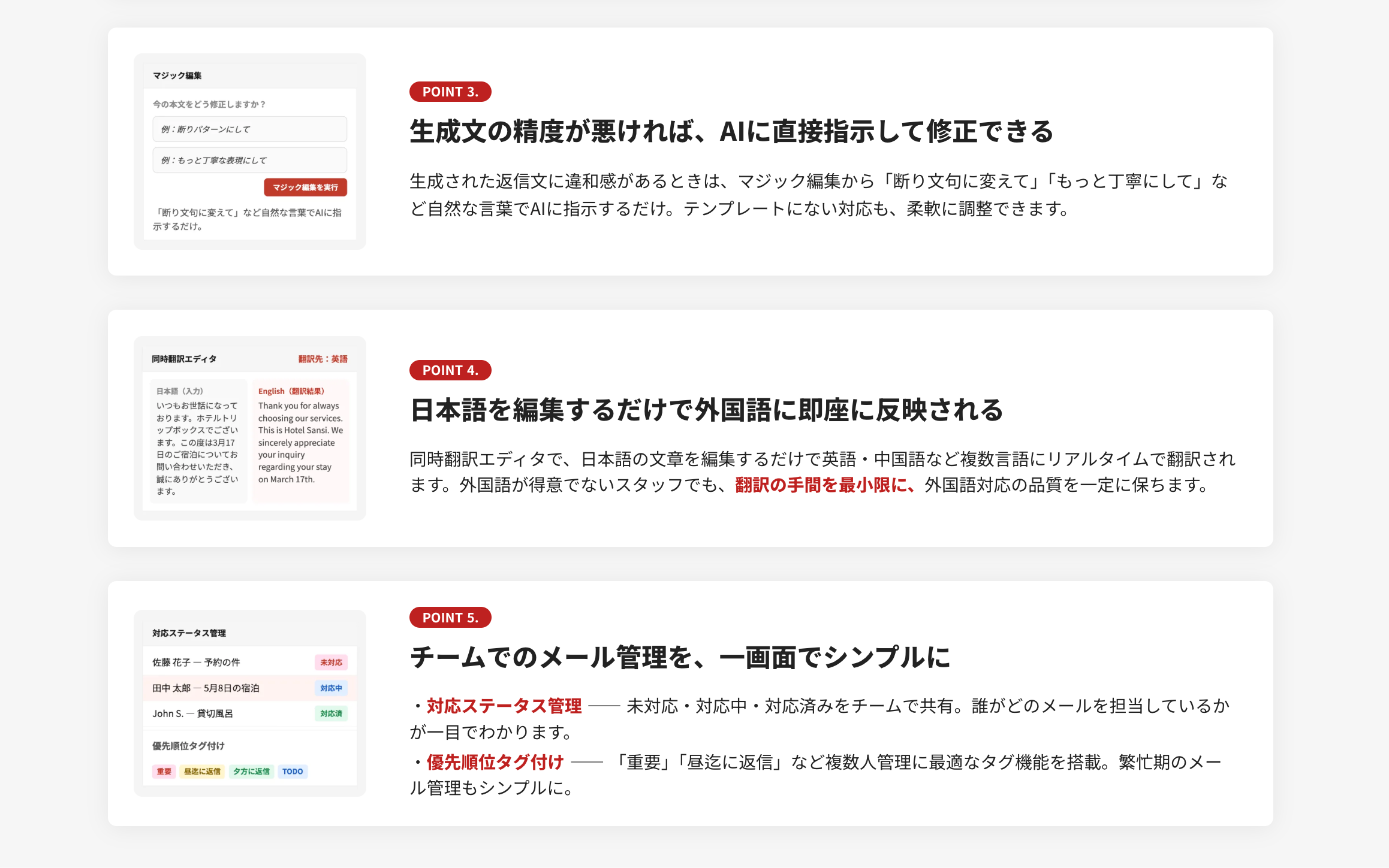 同じようにメール対応の負担を抱える旅館・ホテルにも、役立てていただけるのではないかと感じています。