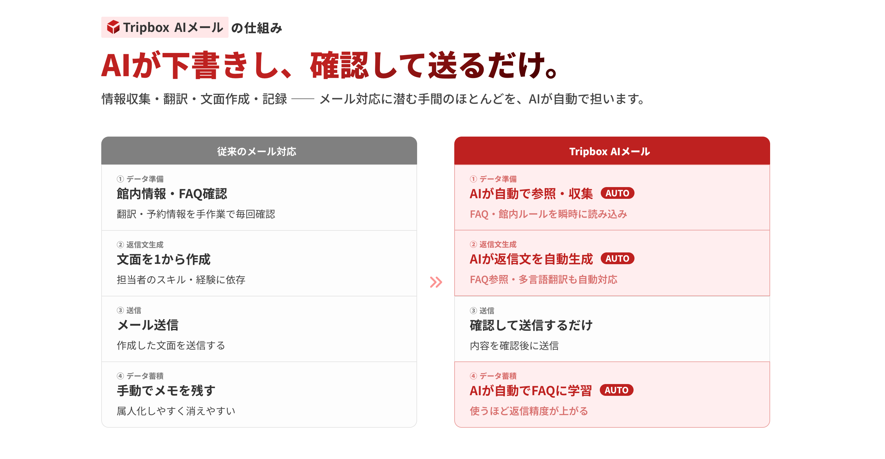 Tripboxサービスサイトより、従来のメール対応と「Tripbox AIメール」を活用したメール対応の差分の説明
