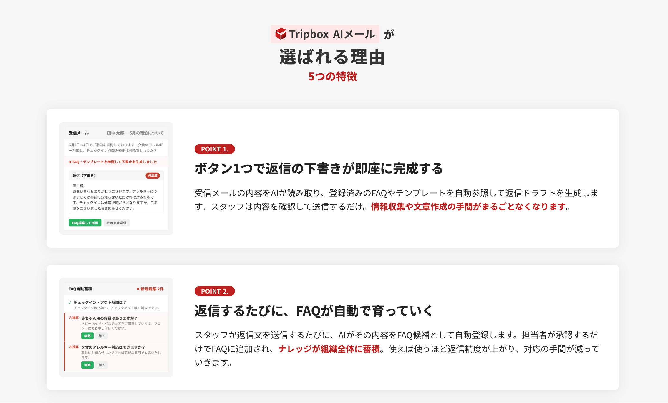 Tripbox サービスサイトより、「Tripbox AIメール」の特徴