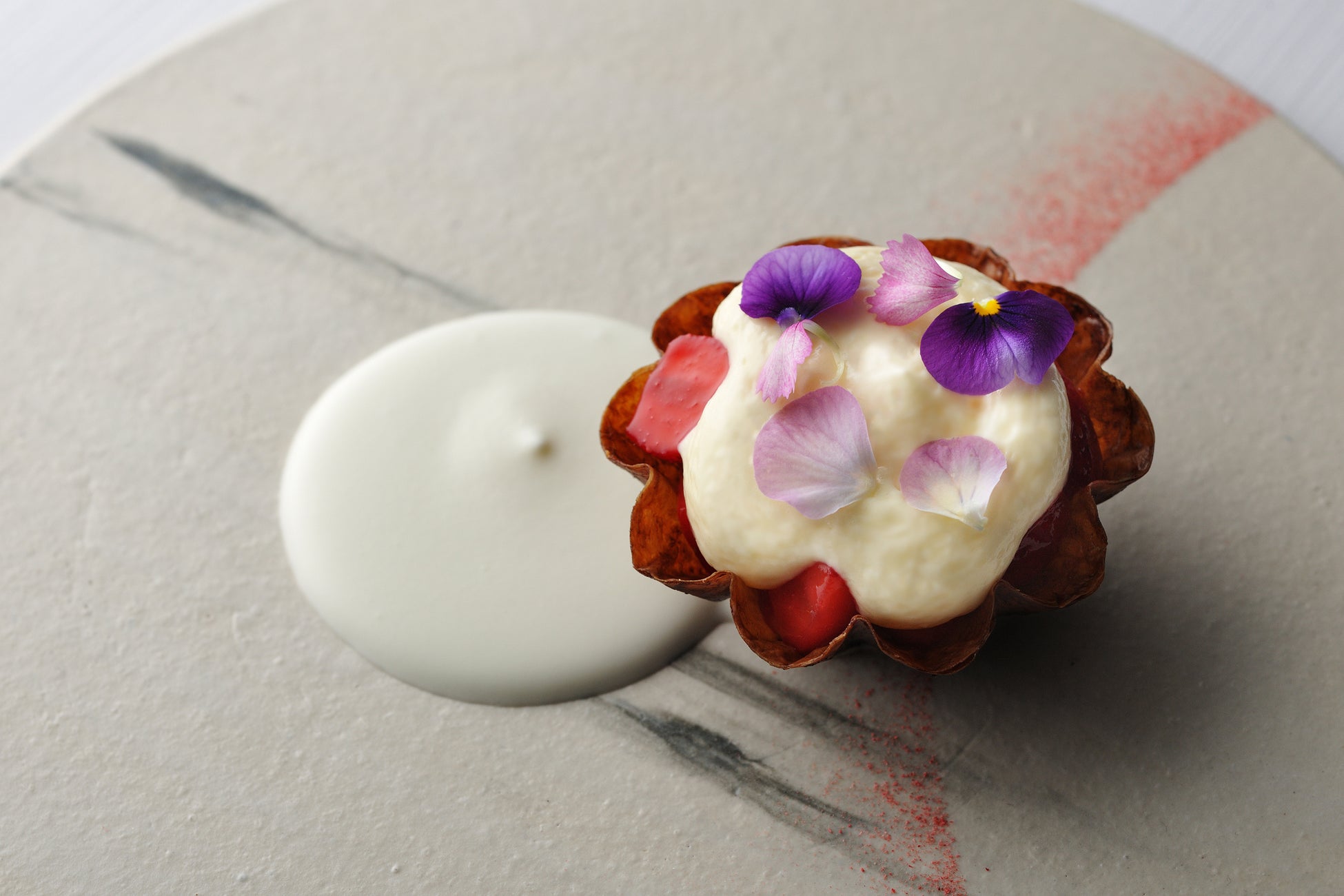 コースを締めくくるのは、旬の苺を使用したメインドルチェです。パリッとした食感のトルタに、ラズベリーピューレでマリネした苺、那須高原産のブリーチーズ「ブリー・ド・那須」のアイスクリーム、ヨーグルトを合わせたカスタードクリームを重ねました。