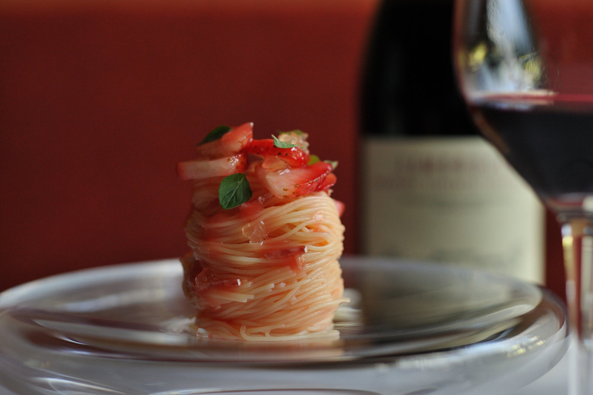 苺とトマトの爽やかな香りと味わいを楽しむ冷製パスタです。熟成されたホワイトバルサミコ酢とも相性のよいサラミを刻んでソースに加えることで旨味を引き出しました。