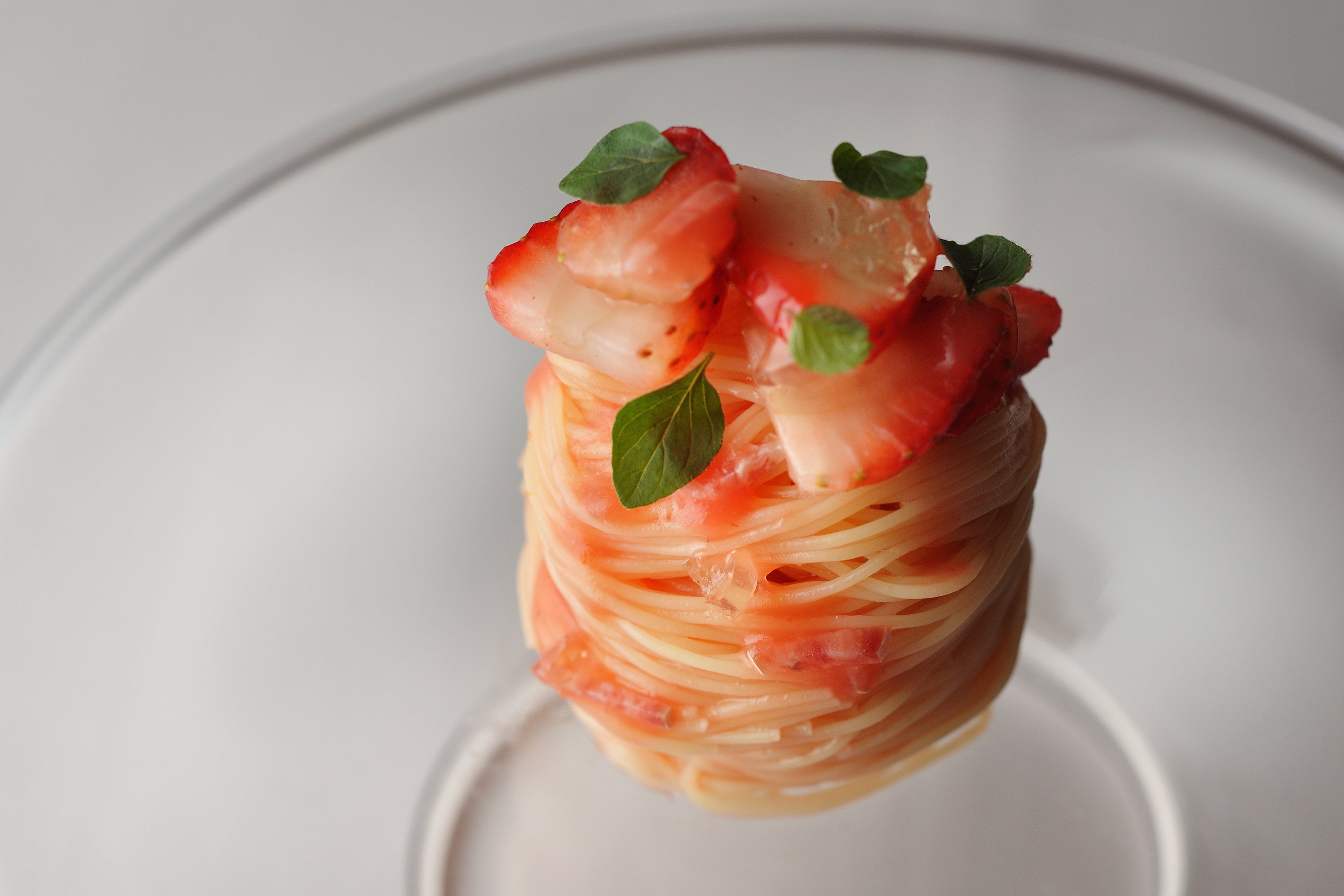 苺とトマトの爽やかな香りと味わいを楽しむ冷製パスタです。熟成されたホワイトバルサミコ酢とも相性のよいサラミを刻んでソースに加えることで旨味を引き出しました。