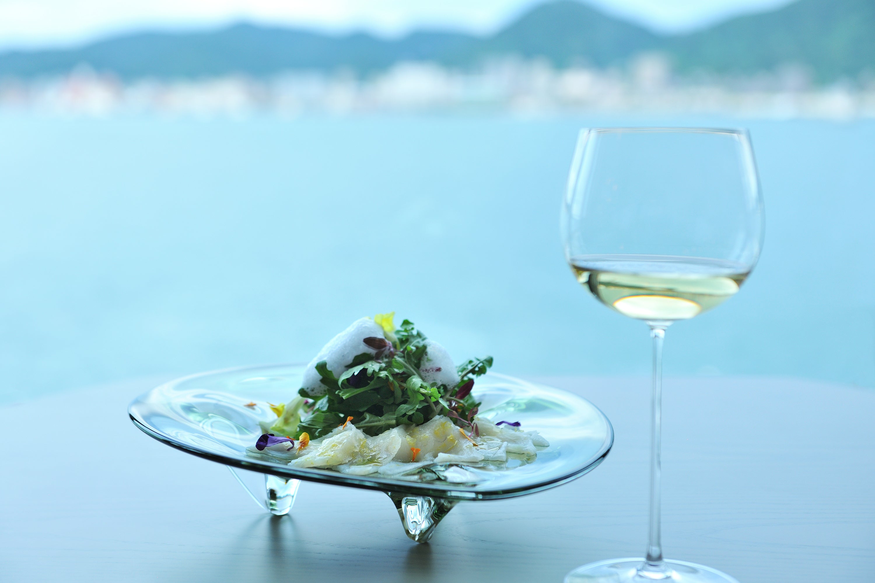 前菜は、ふぐをイタリア料理の定番カルパッチョに仕立て、仕上げに軽やかな柑橘の泡を添えた一皿です。3種のハーブを合わせることで、ふぐの旨味を爽やかな香りが引き立てます。