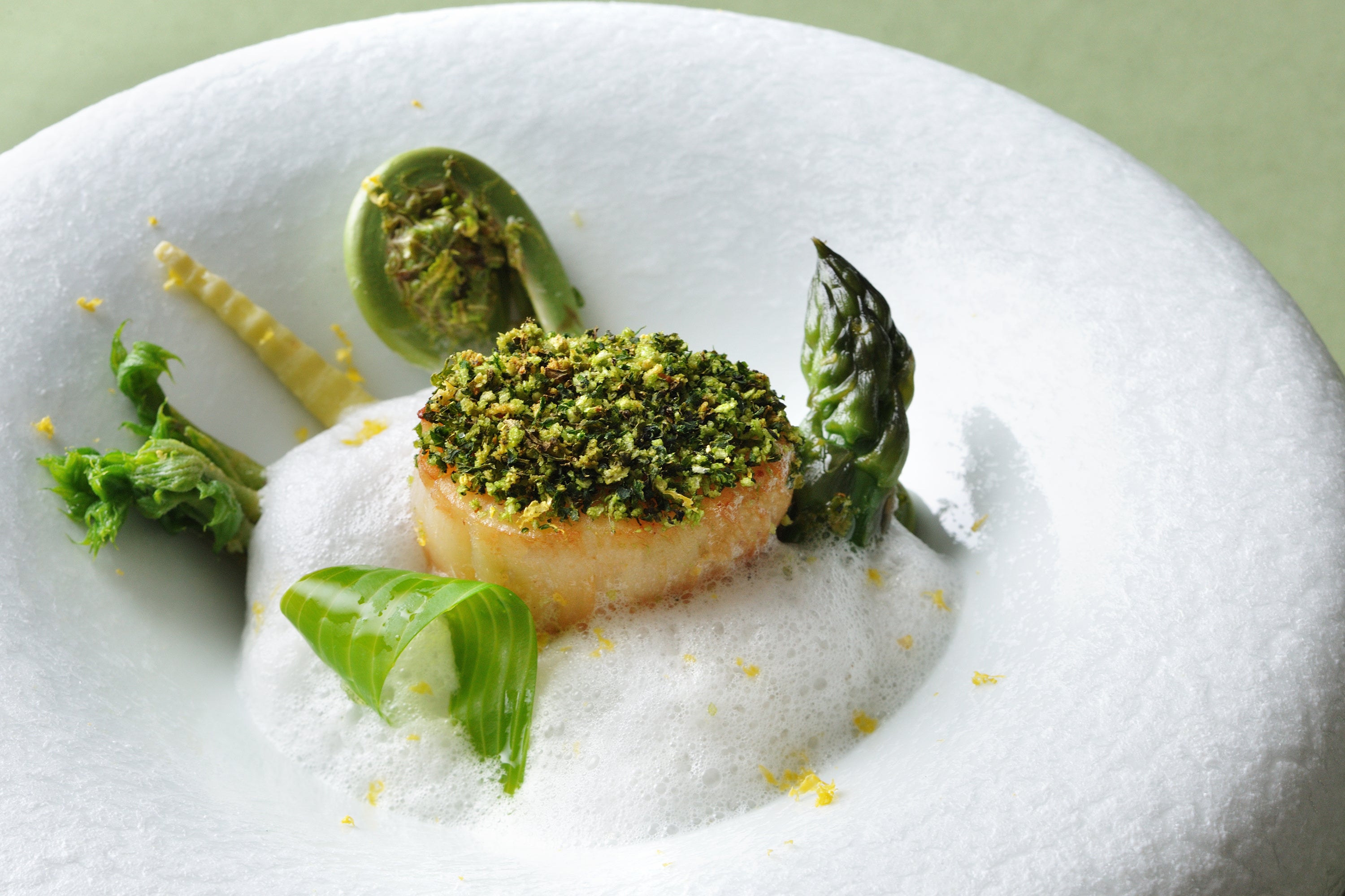 冷前菜は、魚介の旨み溢れる泡が料理全体をまとめ、春の訪れを華やかに感じさせる一皿です。アスパラガスやネマガリダケなど、北海道ならではの春野菜を魚介の旨みを凝縮した軽やかな泡が優しく包み込みます。