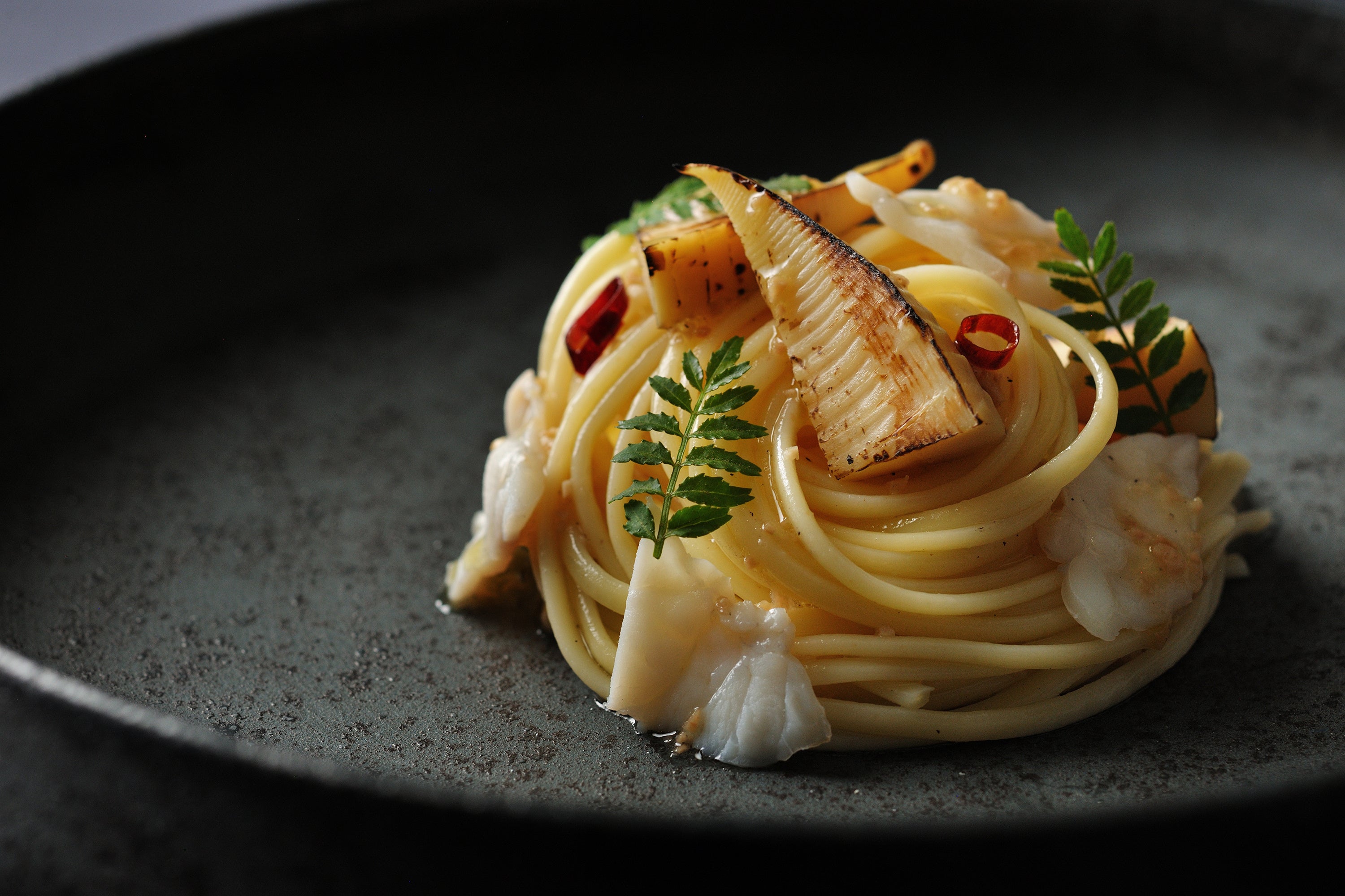 パスタには春の味覚である筍と木の芽、そしてふぐの身のラグーを合わせました。筍は皮ごと茹でることで素材本来の香りと瑞々しい食感を引き出しました。木の芽のさわやかな香りとふぐの旨味が重なり、春の訪れを感じる一皿です。