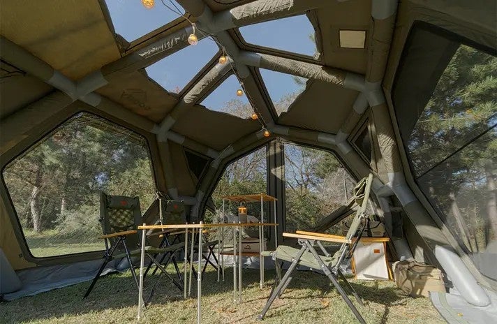 Hub Shelter Proは、ただ広いだけではありません。最適化された内部構造により、実用性と開放感を高次元で両立。着脱式フロアや大型フライシートなどの装備も備えつつ、この“作品級空間”が空気を入れるだけで完成します。設営の手軽さと完成度の高さを両立した、新しいエアシェルターです。