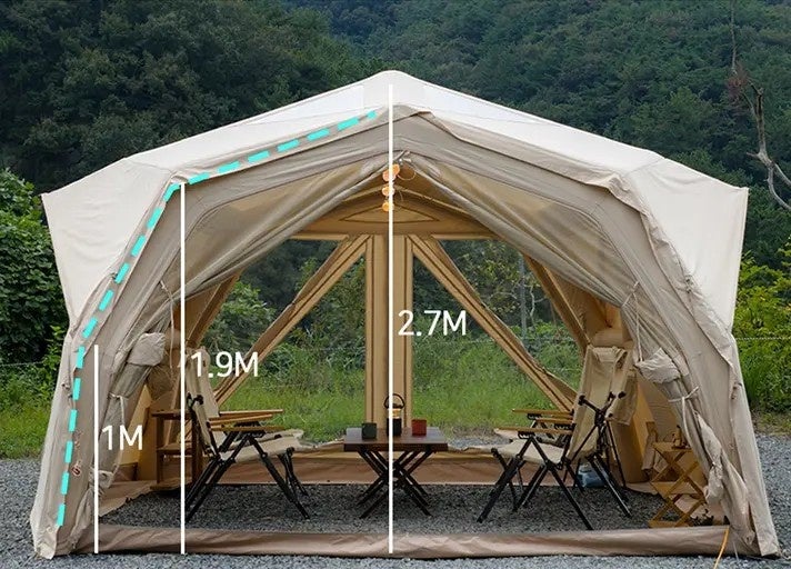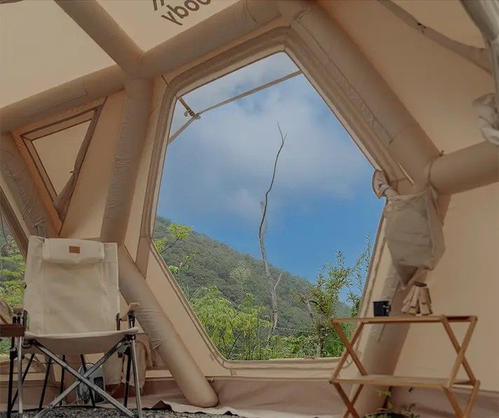 Hub Shelter Proは、ただ広いだけではありません。最適化された内部構造により、実用性と開放感を高次元で両立。着脱式フロアや大型フライシートなどの装備も備えつつ、この“作品級空間”が空気を入れるだけで完成します。設営の手軽さと完成度の高さを両立した、新しいエアシェルターです。