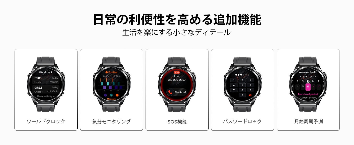 • 機能:Bluetooth通話/健康管理/178種スポーツモード/AI音声アシスタント/SOS機能