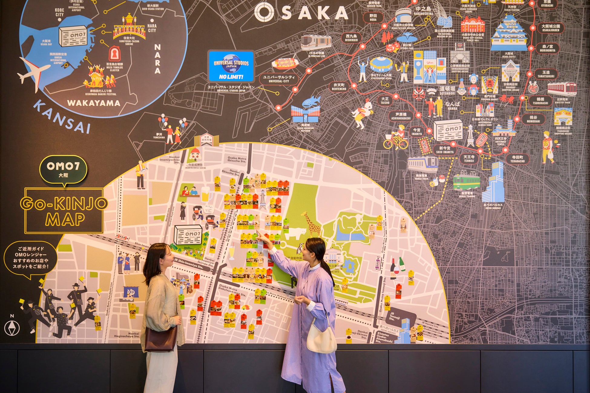 イベント当日は一分一秒が勝負です。街のプロ「OMOレンジャー」が、初めての大阪でも迷わずスマートに会場へ辿り着けるアドバイスや、打ち上げにぴったりな大阪らしいスポットを”おせっかい”に提案。また、ライブ終了後の興奮を分かち合う打ち上げや、イベントの延長線上の大切な時間をデザインします。さらに、館内の巨大な「ご近所マップ」には、スタッフが自ら歩いて見つけた深夜営業のバーなど、ガイドブックには載らないディープなお店の情報が満載です。イベントの余韻だけでなく、街の魅力を味わいつくせます。