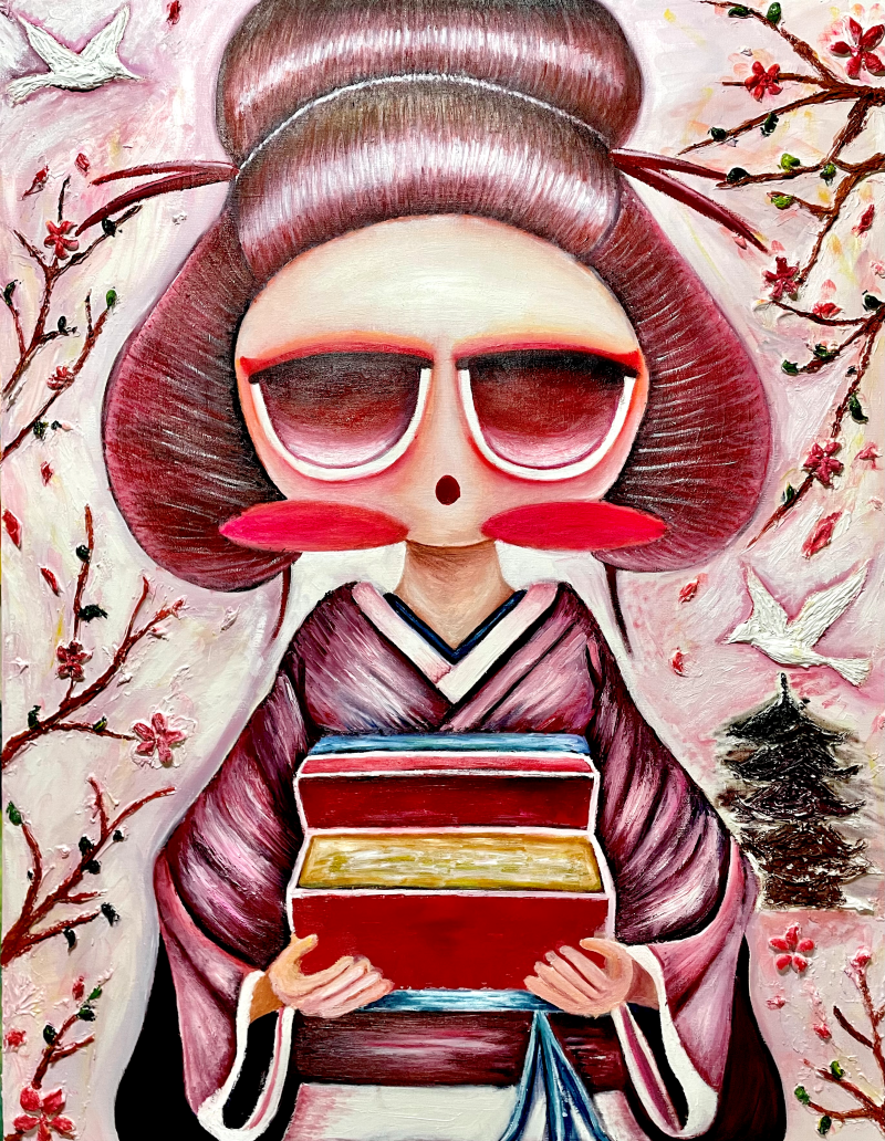 艶やかな着物を纏った少女が、空の宝箱を抱えて静かに佇む作品。背景には桜の舞う空、白鷺、五重塔といった、京都ならではの美と静寂が織り込まれています。この宝箱は「何もない」ことを意味するのではなく、「これから何を入れるかを子ども自身が自由に決められる未来の可能性」を象徴しています。桜は新しい始まり、白鷺は自由、五重塔は時間の蓄積。それらが少女を優しく包み込み、「選べる自由」と向き合う大切さを静かに語りかけてきます。