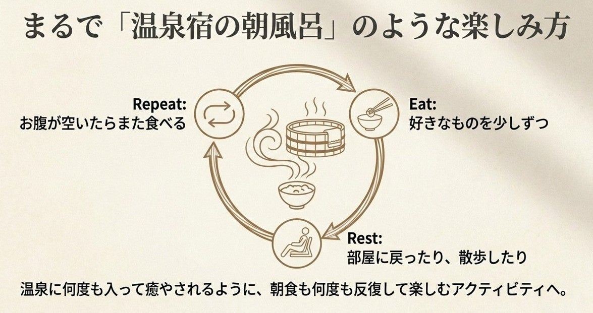 無限朝食は、それはまるで温泉に何度も入って癒されるような楽しみ方だと私たちは考えています。