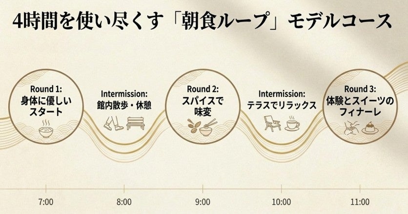 11時まで(平日は11時まで)の朝食時間、最大4時間を体験し尽くす(使い尽くす)ためのモデルコースを作成してみました。