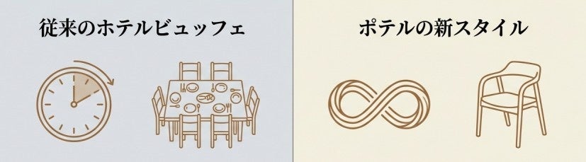 こう変わる! 従来のホテルビュッフェと、ポテルの新朝食スタイルの比較