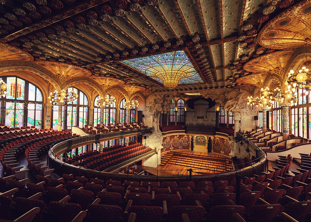 ステンドグラスやモザイク装飾に彩られた華やかな空間は、「光の音楽堂」とも称され、バルセロナを代表する文化施設のひとつです。