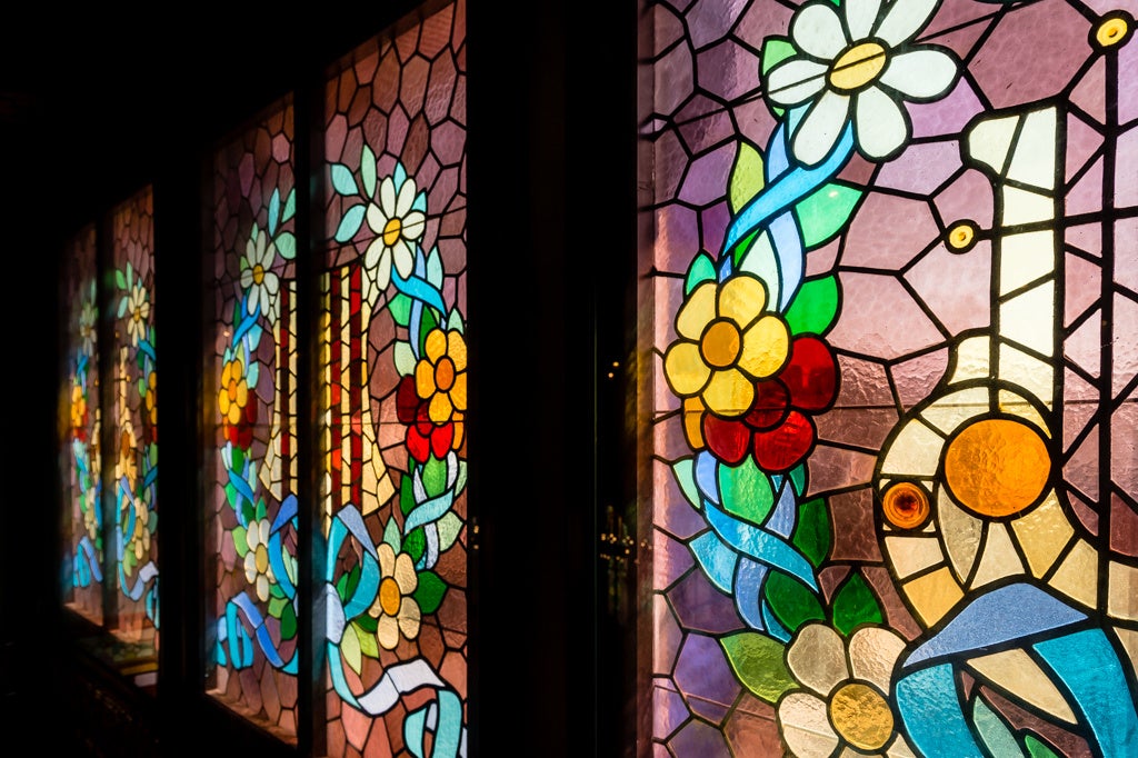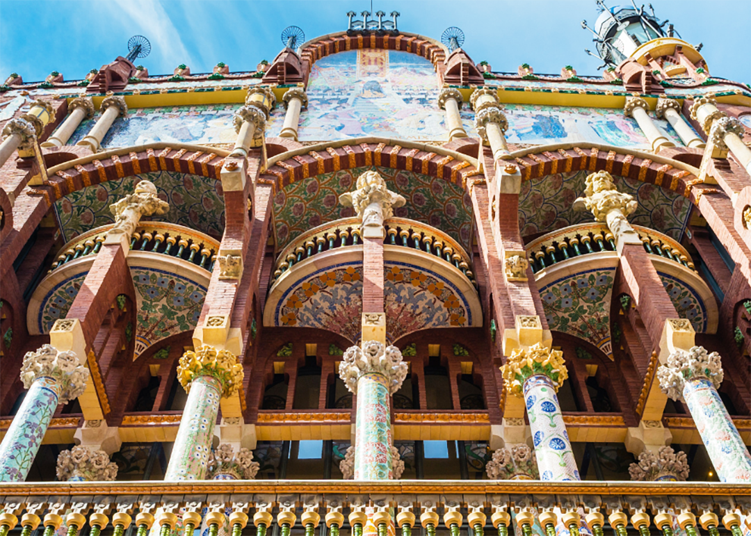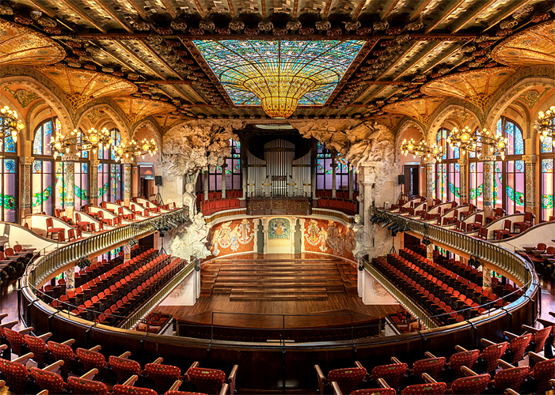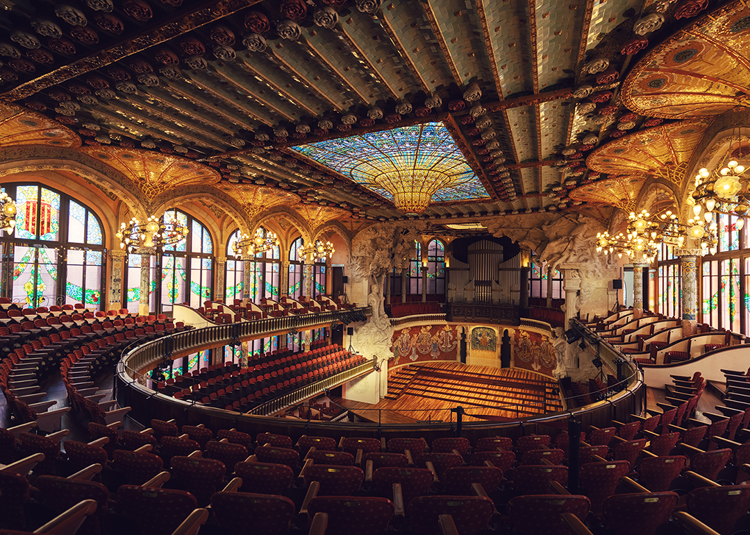 ステンドグラスやモザイク装飾に彩られた華やかな空間は、「光の音楽堂」とも称され、バルセロナを代表する文化施設のひとつです。