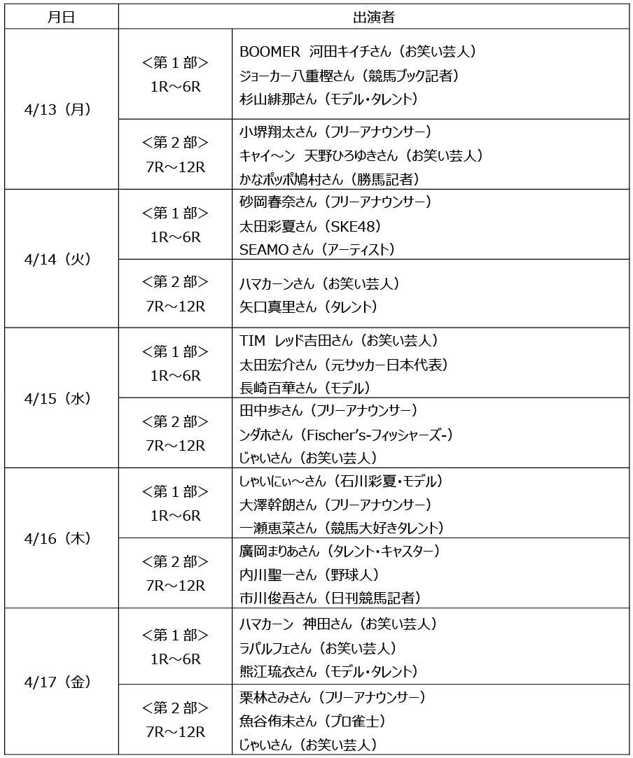 4月15日(水)、4月16日(木)の2日間、TCKに精通するゲストが東京スプリントやブリリアントカップの予想に挑戦する「重賞予想トークステージ」を実施します。日替わりのゲスト陣が繰り広げる予想は果たして!? 当日は、ぜひトゥインクルステージにお越しください。