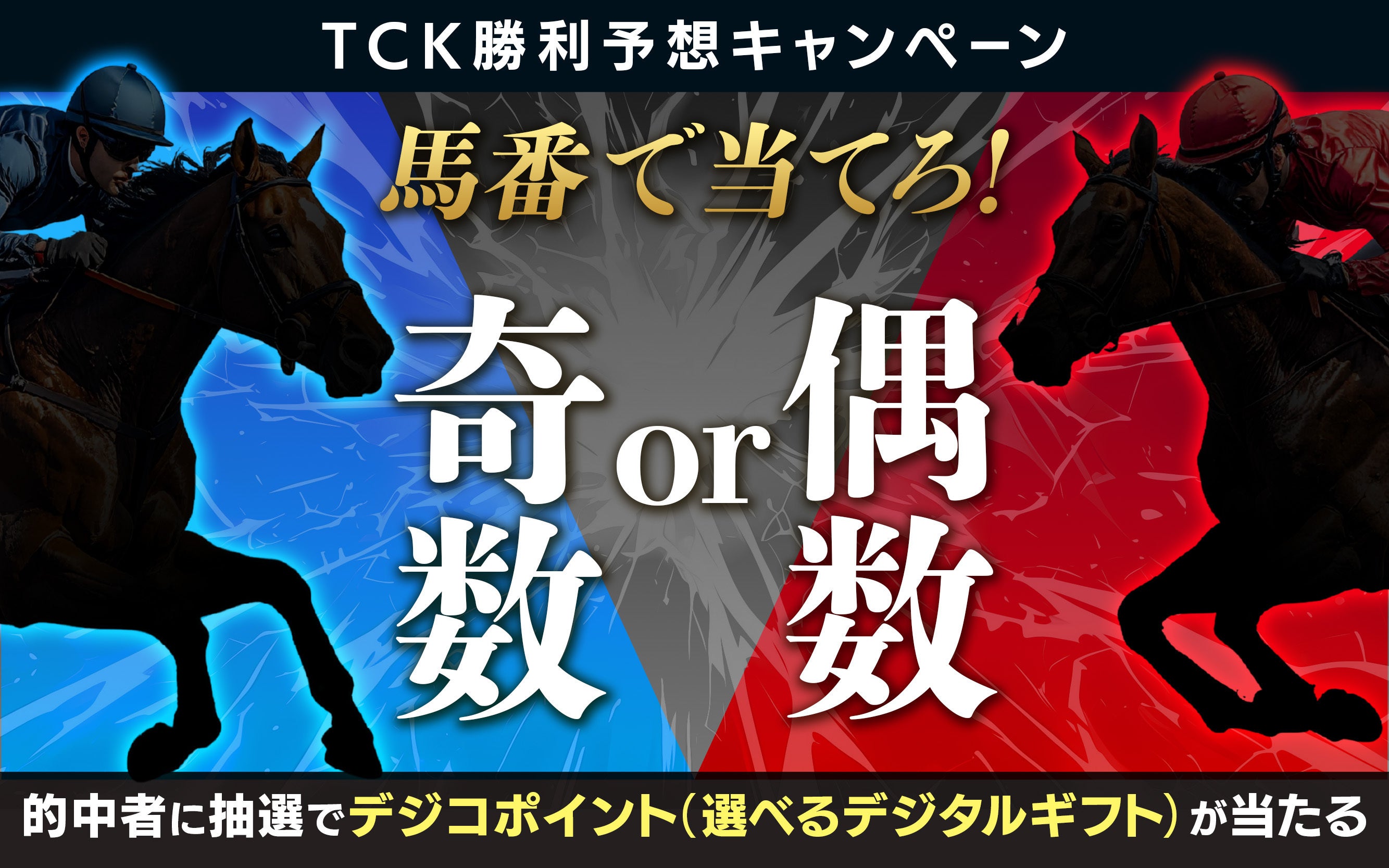 参加方法は、TCK公式Xアカウント(@tck_keiba)をフォローし、「勝ち馬の馬番は奇数か偶数か」を予想してキャンペーン投稿内の選択肢をクリックするだけ!予想が的中した方の中から抽選で100名様にデジコポイントをプレゼントします。