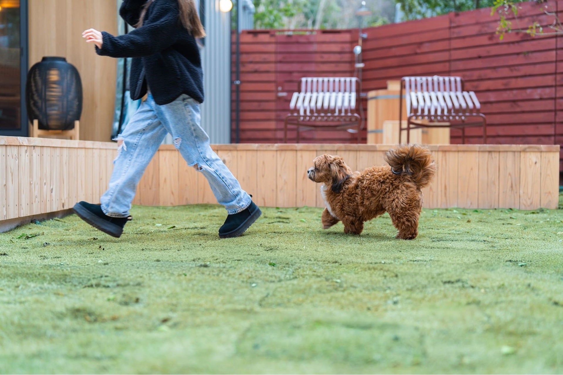 なお、ヴィラは3棟がドッグフレンドリータイプで超小型~中型犬までご利用いただけますので、大切な家族である愛犬とともにのびのびとお過ごしいただくことも可能です。