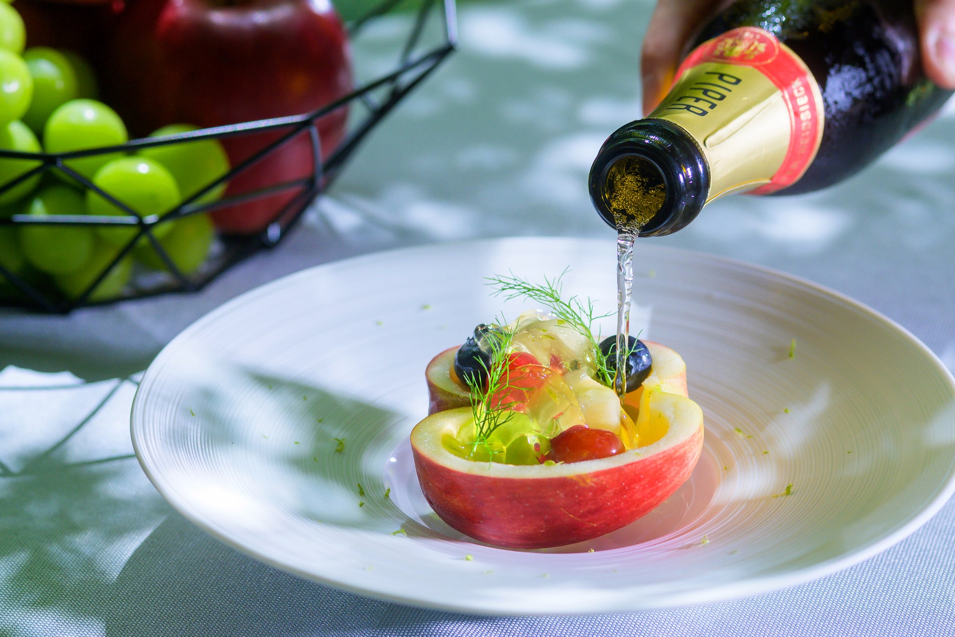 渓流沿いのスポットで、瑞々しいフルーツを使用した涼やかな「ジュレ・ド・フリュイ」を味わえます。さわやかなりんごをはじめとしたフルーツを、シャンパーニュの香りが爽やかに広がるジュレと絡めました。お好みでさらにシャンパーニュを注ぎ入れ、ひんやりと冷たいフルーツとジュレを味わう、夏らしい贅沢な早朝の体験です。