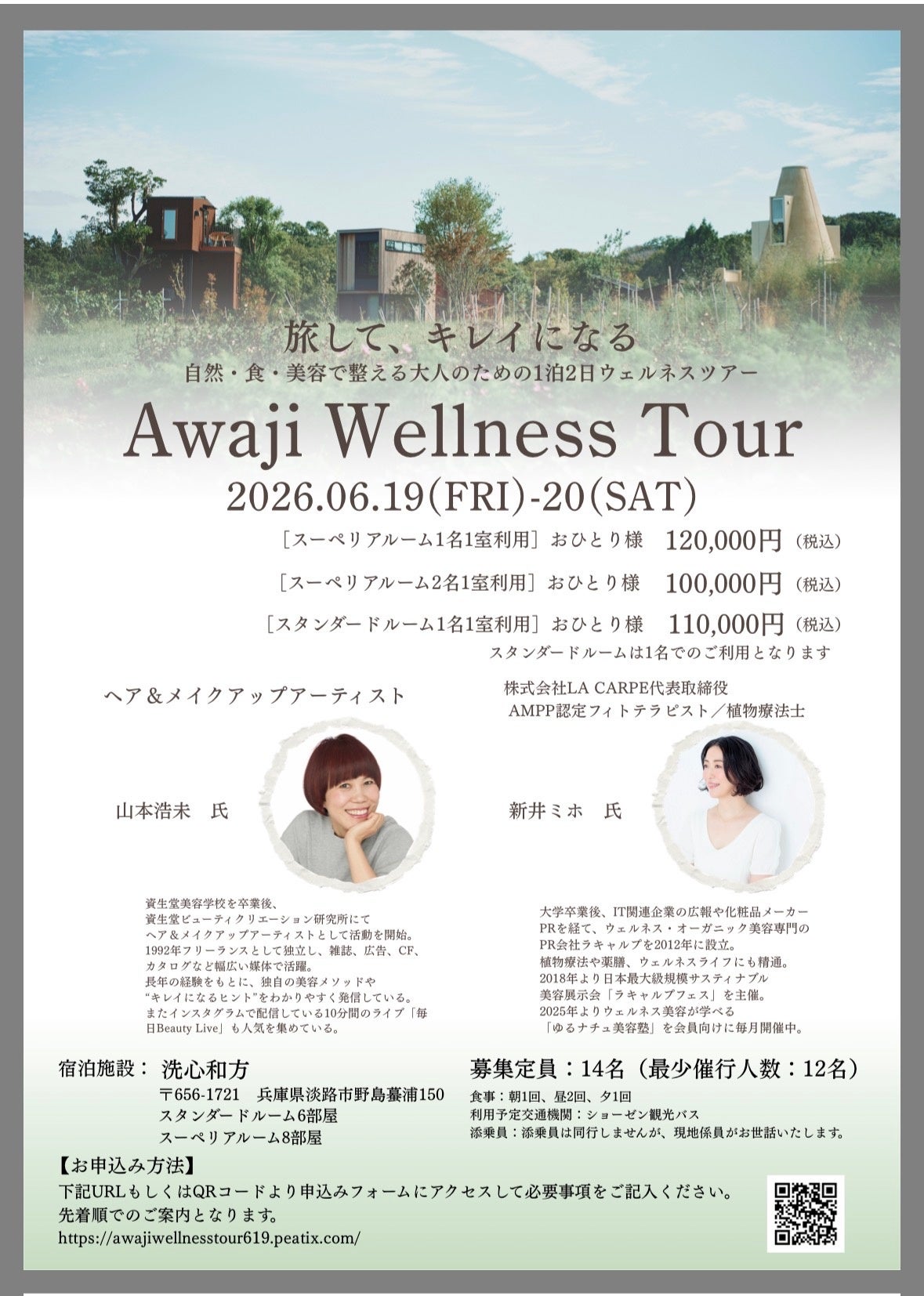 株式会社ラキャルプ(本社:東京都、代表取締役:新井ミホ)は、ヘアメイクアップアーティスト 山本浩未 氏とともに、「旅して、キレイになる。」をコンセプトとした、新しいウェルネス美容ツアー第3弾「Awaji Wellness Tour」を、2026年6月19日(金)〜20日(土)に兵庫県・淡路島にて開催いたします。