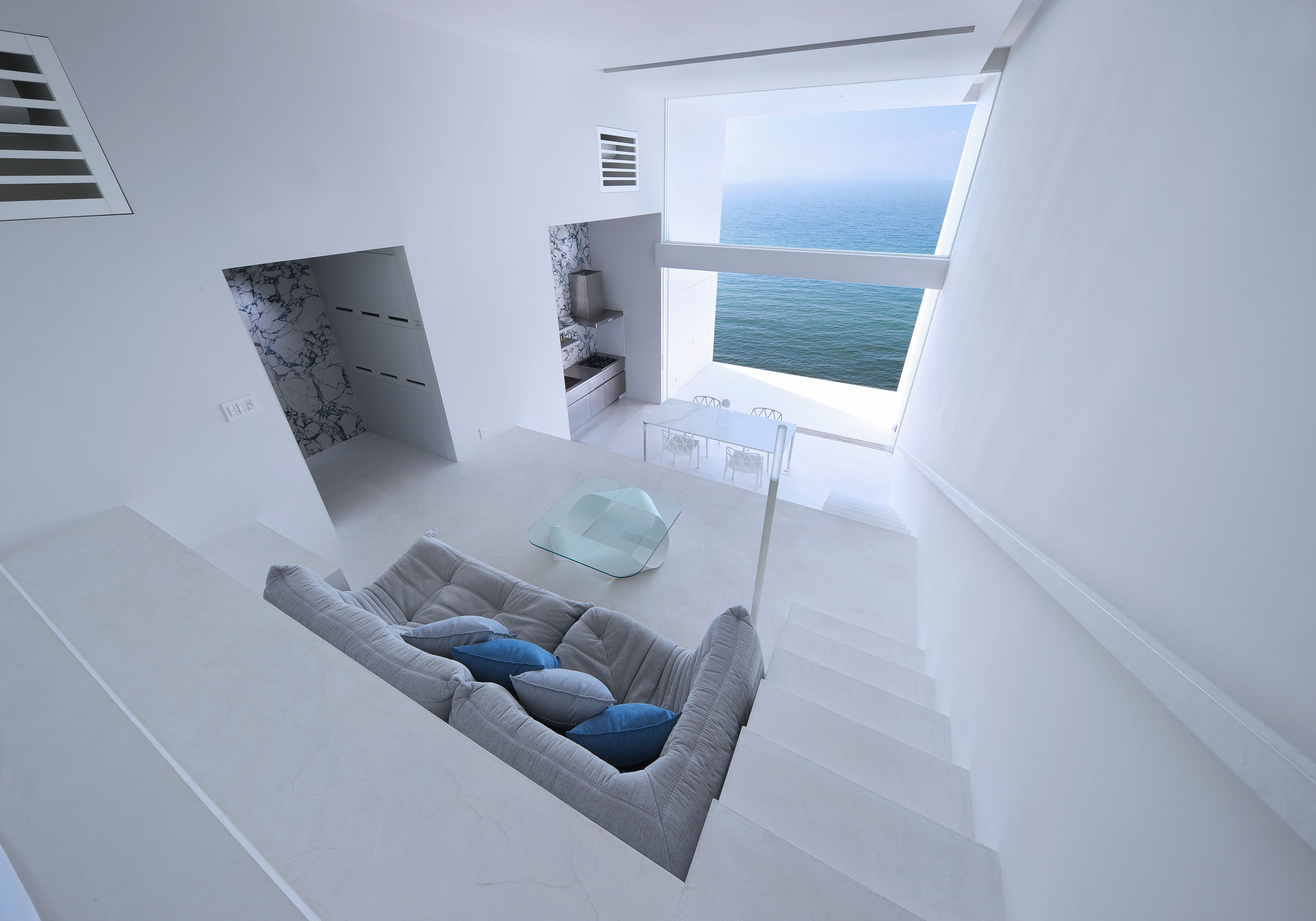 S.STAIRSは名前の通り階段をイメージしたステップフロア構造となっており、最上段(寝室)、中段(リビング)、下段(ダイニング)と空間が連続しながら、どの場所からも海と空を眺められる設計となっています。