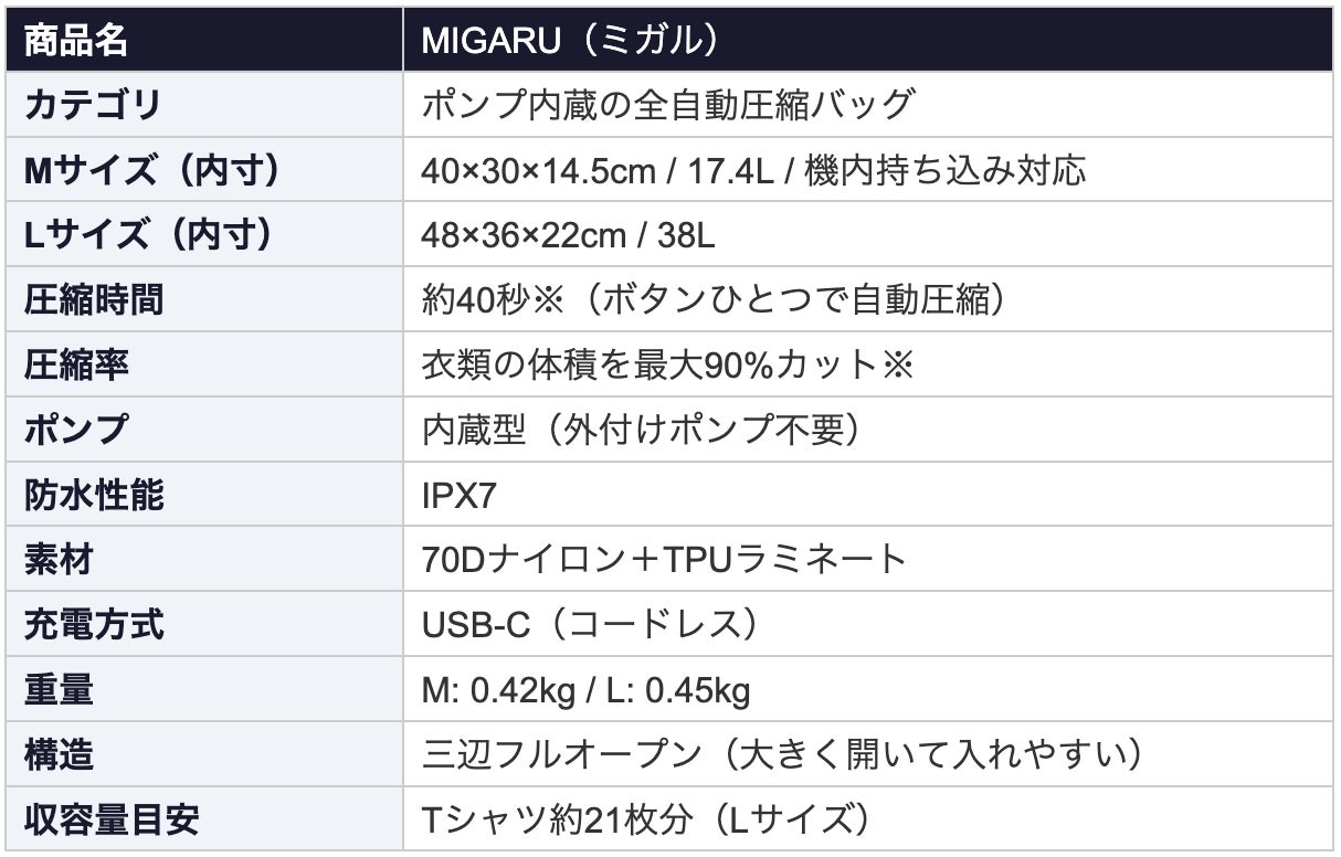 プロジェクト名: 詰めて押すだけ、40秒で圧縮完了。荷物は多く、バッグは小さく。『MIGARU』