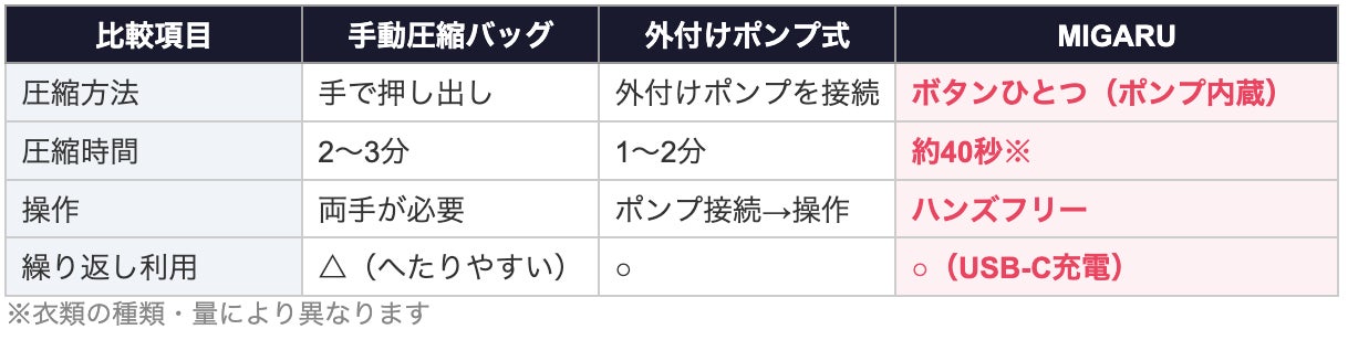 圧縮バッグを使わなくなった人にこそ、MIGARUを試してほしい。」面倒くさい「が理由で圧縮を諦めた方に、ボタンひとつの体験をお届けしたいんです。そして旅行以外でも、衣替えのたびにクローゼットと格闘している方にとって、MIGARUは年中使える」収納のパートナー「になれると思っています