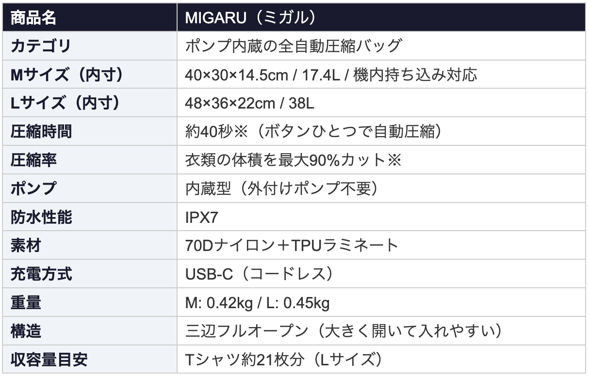 合同会社onigiri(東京都渋谷区、代表:青木真美)は、ポンプ内蔵の全自動圧縮バッグ「MIGARU(ミガル)」を、応援購入サービスMakuakeにて4月14日よりプロジェクトを開始いたします。本リリースでは、従来の圧縮バッグが抱える「使わなくなる問題」と、MIGARUが提案する旅行×収納の“二刀流”活用法をご紹介します。