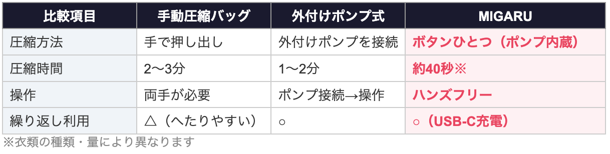 旅行だけなら年に数回の出番ですが、収納にも使えば年間を通じて活躍します。USB-C充電で繰り返し使え、使い捨て圧縮袋のように買い足す必要もありません。