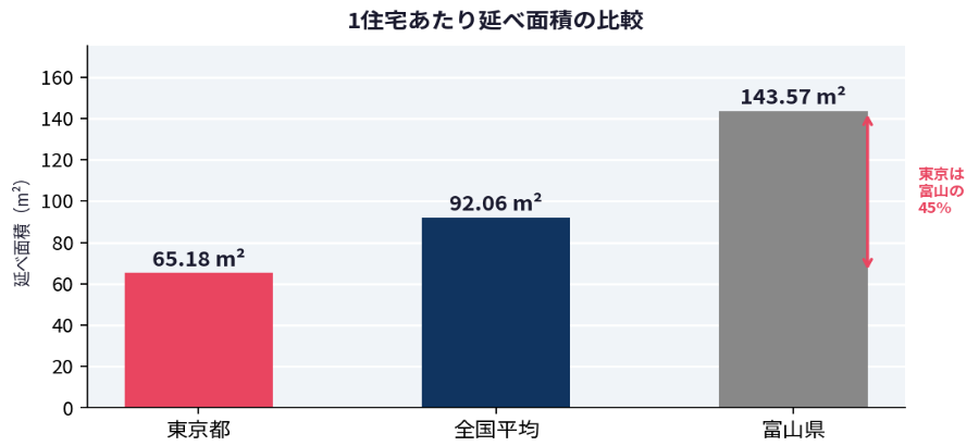 特に都市部では、住宅面積の制約が深刻です。総務省「住宅・土地統計調査」(平成30年)によると、東京都の1住宅あたり延べ面積は65.18m²で、全国平均92.06m²の約71%にとどまります。富山県(143.57m²)と比べると半分以下です。限られた収納スペースに、四季分の衣類を収めなければなりません。