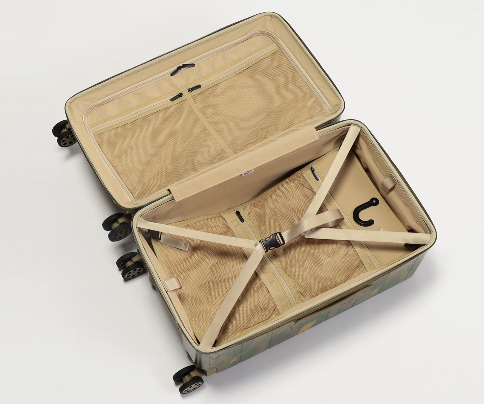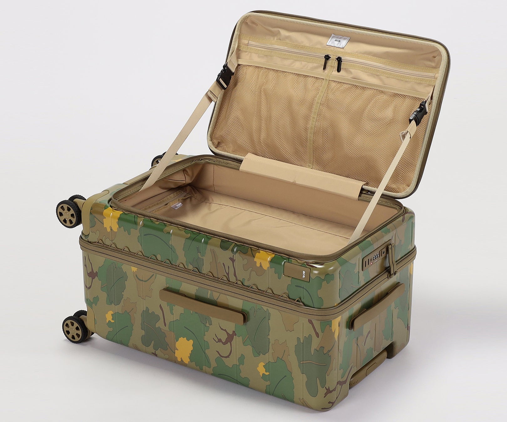 ・葉や雲をモチーフにした迷彩柄を採用。自然に溶け込み、空港で見つけやすいデザインです。