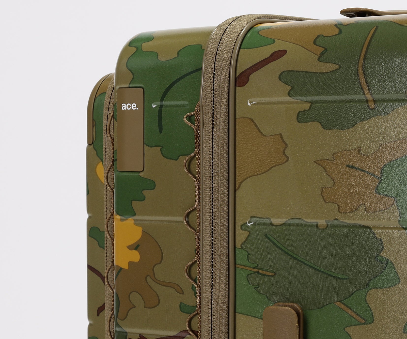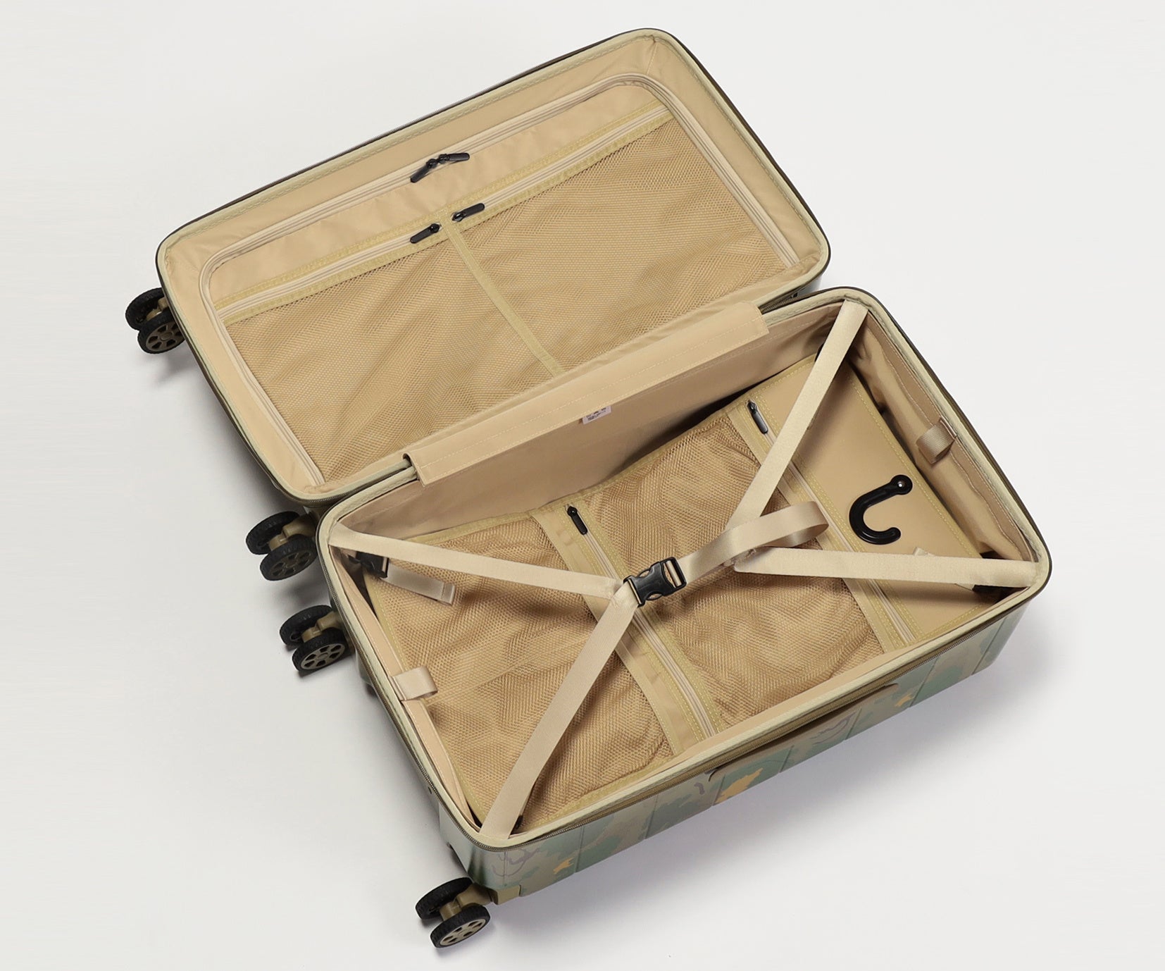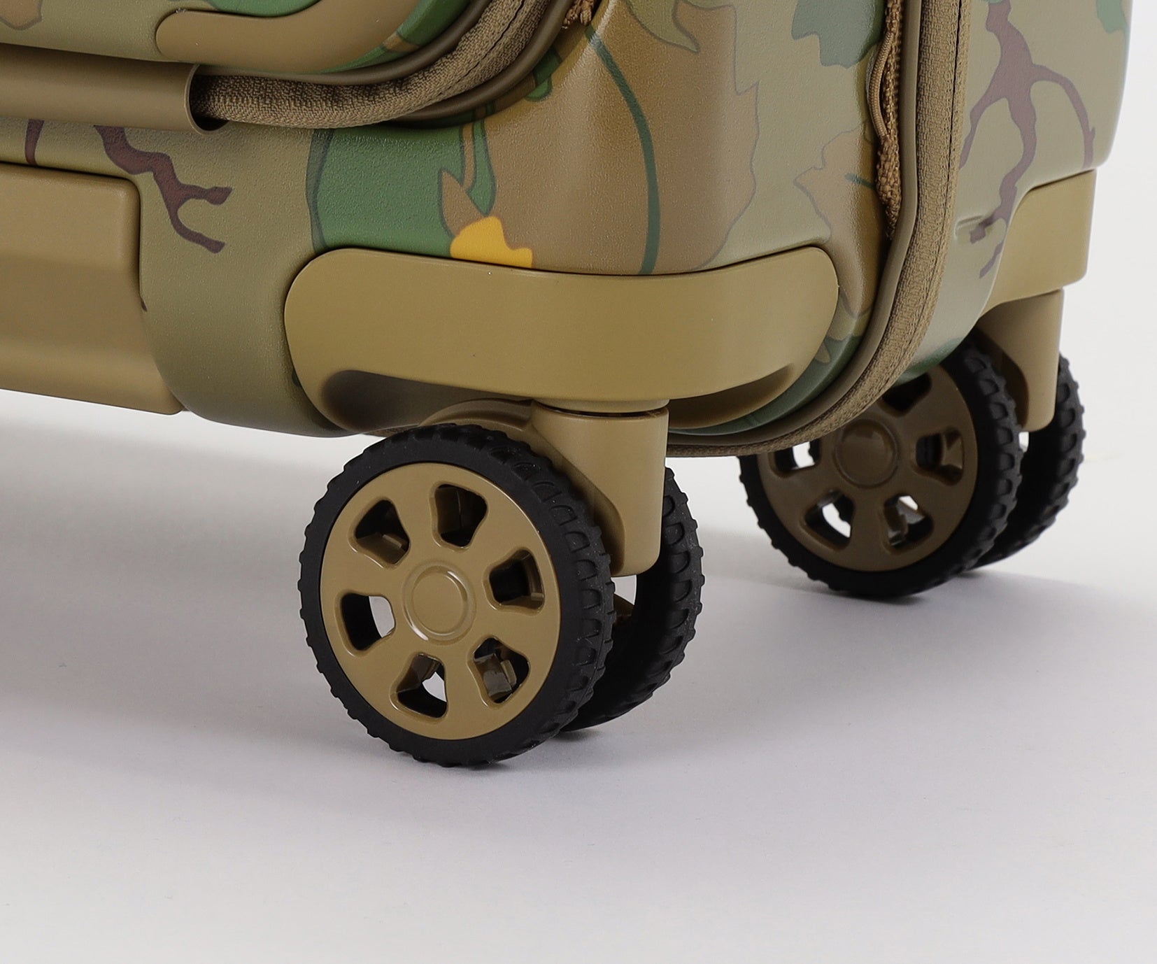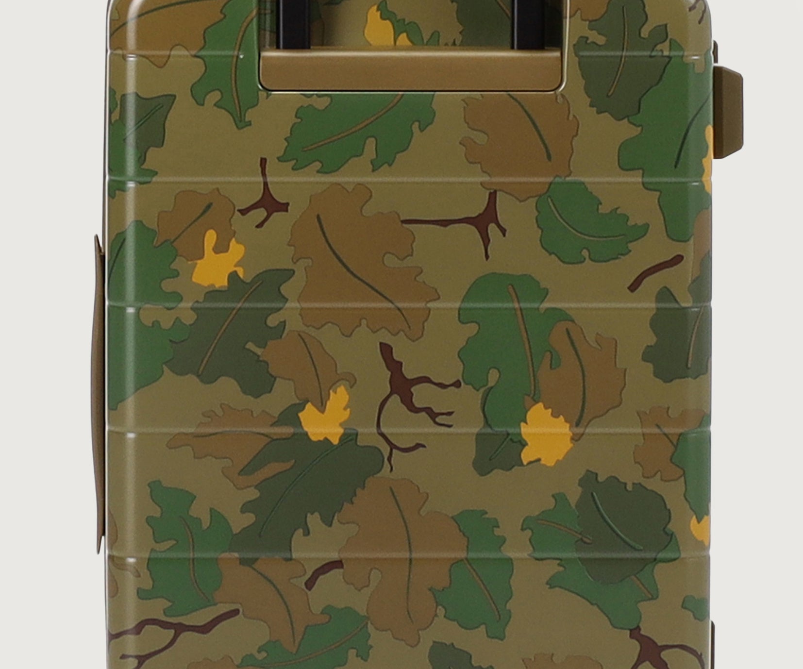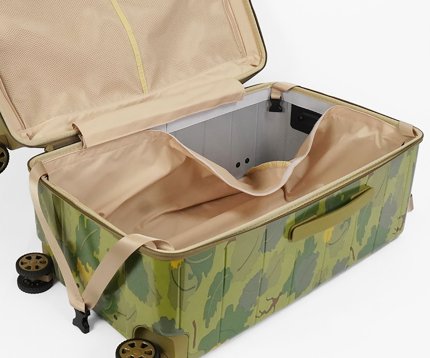 ・葉や雲をモチーフにした迷彩柄を採用。自然に溶け込み、空港で見つけやすいデザインです。