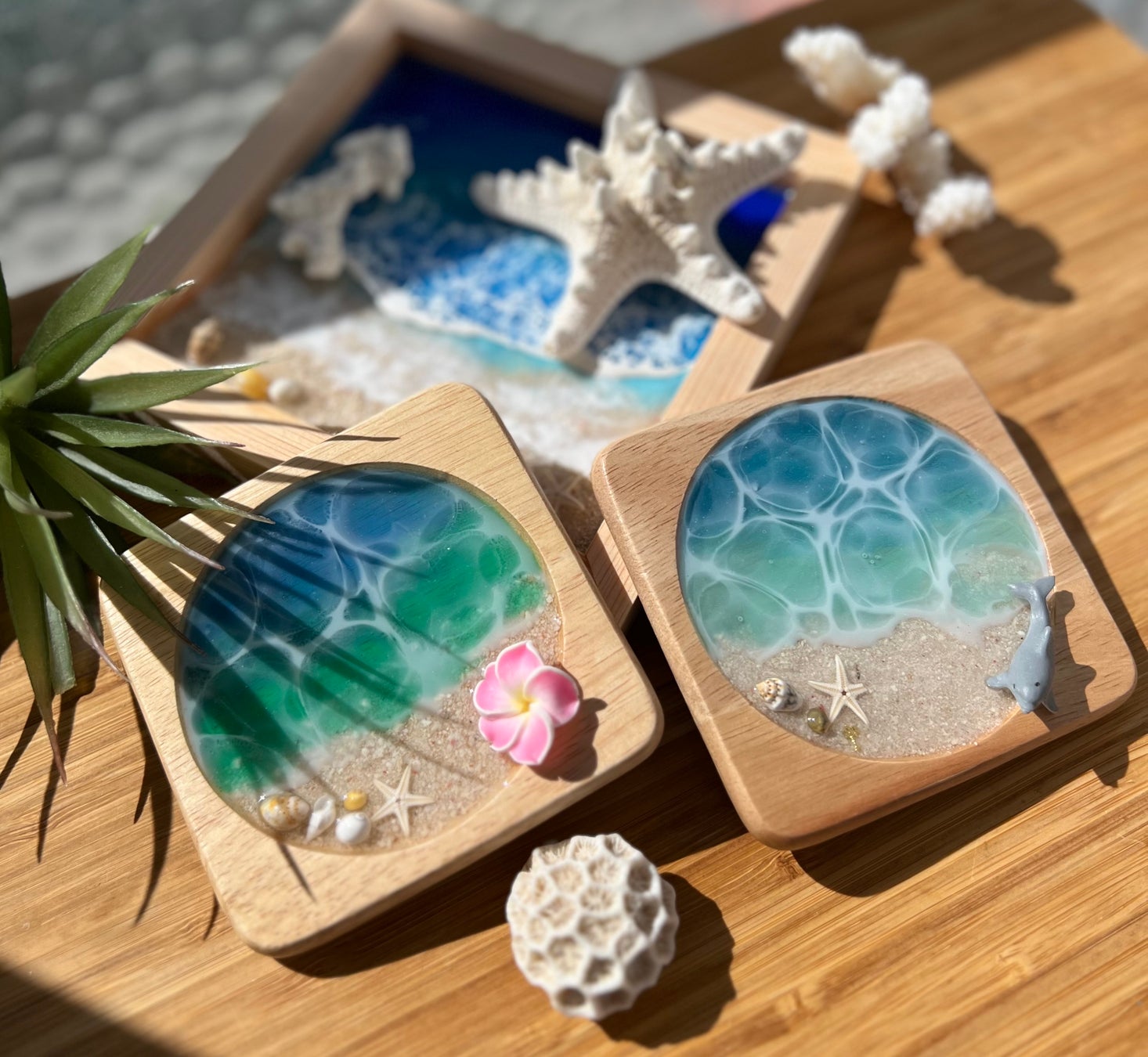 海の色を付けたレジンに、白いレジンを使って、リアルな波紋を表現。世界に一つだけのコースターを制作します。