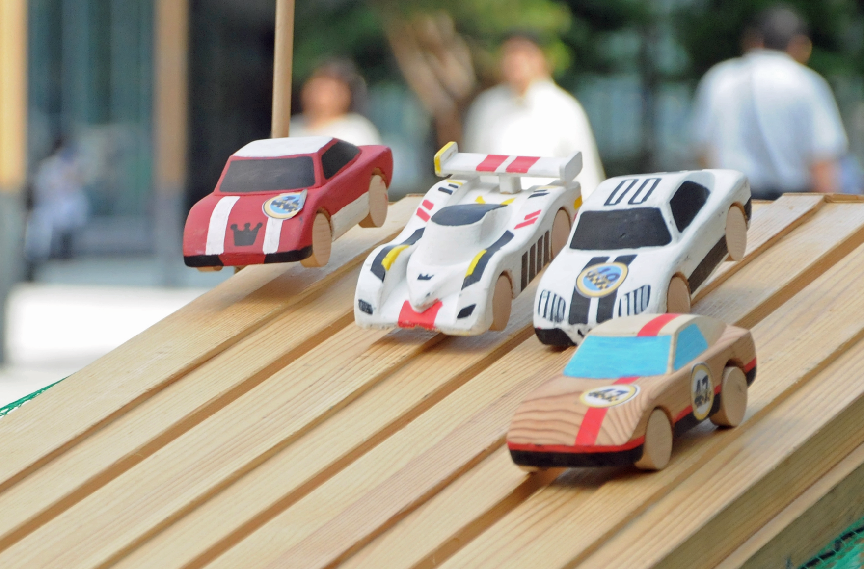黒板消しサイズの木製ミニカーを組み立て、自由に着色。完成後は、動力を使わない10mの傾斜コースでタイムを競うレースに挑戦します。4回のタイムアタック形式で実施します。