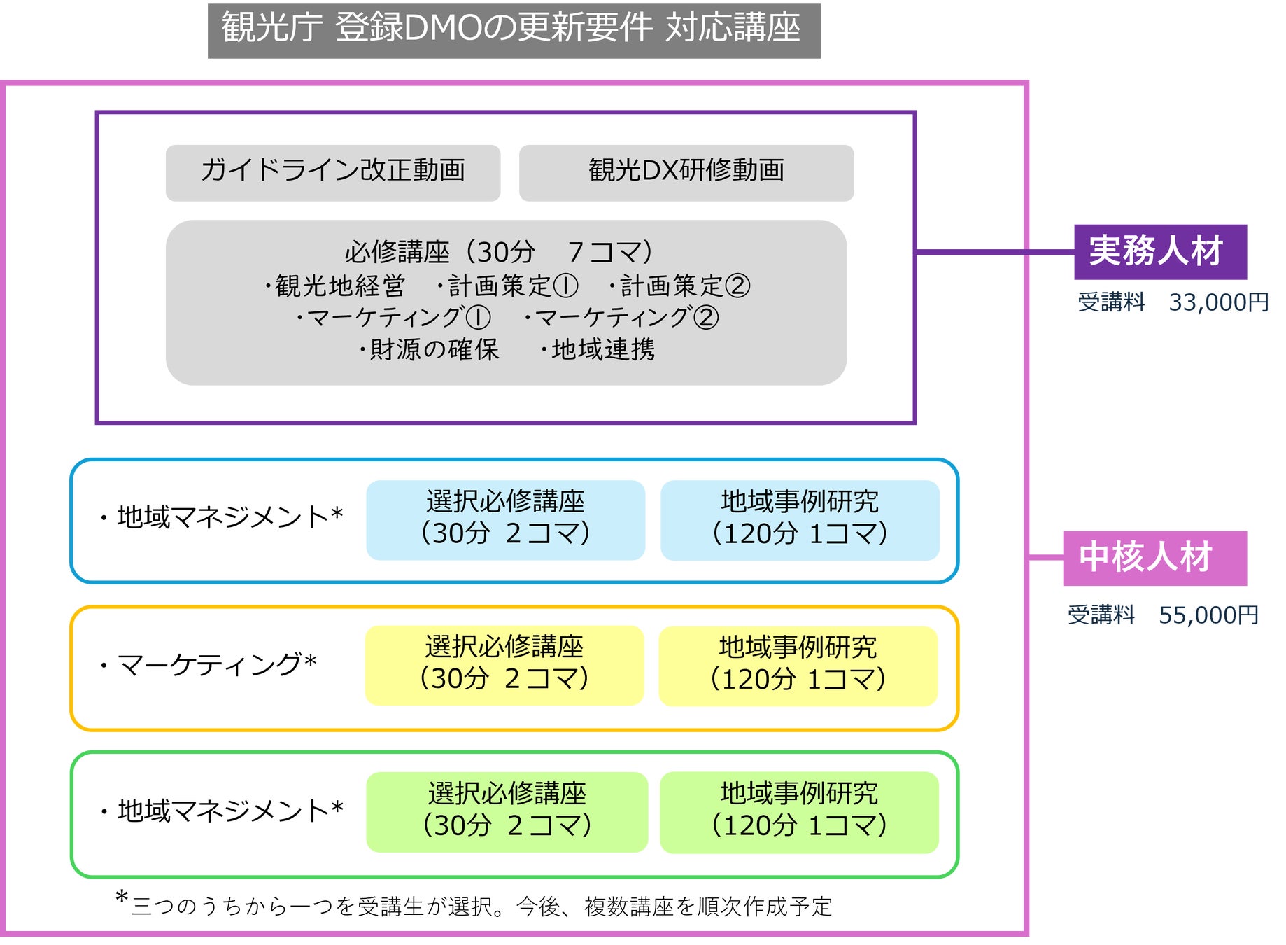 本プログラム(2025年10月6日~2026年3月31日実施)は、各DMOにおいて3名以上の受講が必須とされているDMOの更新登録要件に対応した「観光地域づくり法人の中核・実務人材向け研修」として、観光庁に選定されている研修のうちの一つです。観光地域づくりを担う人材の育成を目的に、「実務人材」および「中核人材」の2つのコースを設け、地域マネジメントやマーケティング、組織マネジメント等の実践的な内容を提供しています。