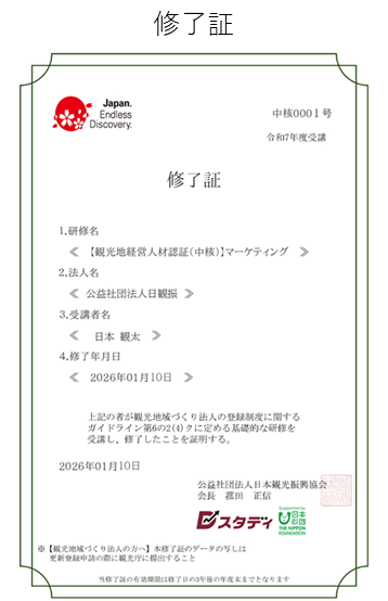 公益社団法人日本観光振興協会(東京都港区 会長 菰田正信(三井不動産(株)代表取締役会長)は、当協会が運営する観光地経営人材認証「Dスタディ」について、2025年度の修了者実績をとりまとめましたので、お知らせいたします。