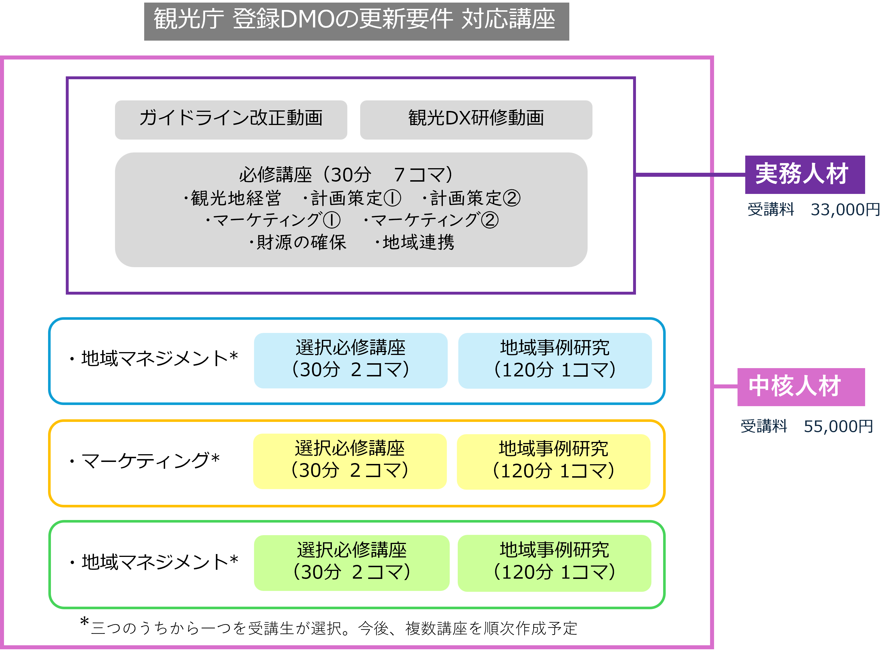 本プログラム(2025年10月6日~2026年3月31日実施)は、各DMOにおいて3名以上の受講が必須とされているDMOの更新登録要件に対応した「観光地域づくり法人の中核・実務人材向け研修」として、観光庁に選定されている研修のうちの一つです。観光地域づくりを担う人材の育成を目的に、「実務人材」および「中核人材」の2つのコースを設け、地域マネジメントやマーケティング、組織マネジメント等の実践的な内容を提供しています。