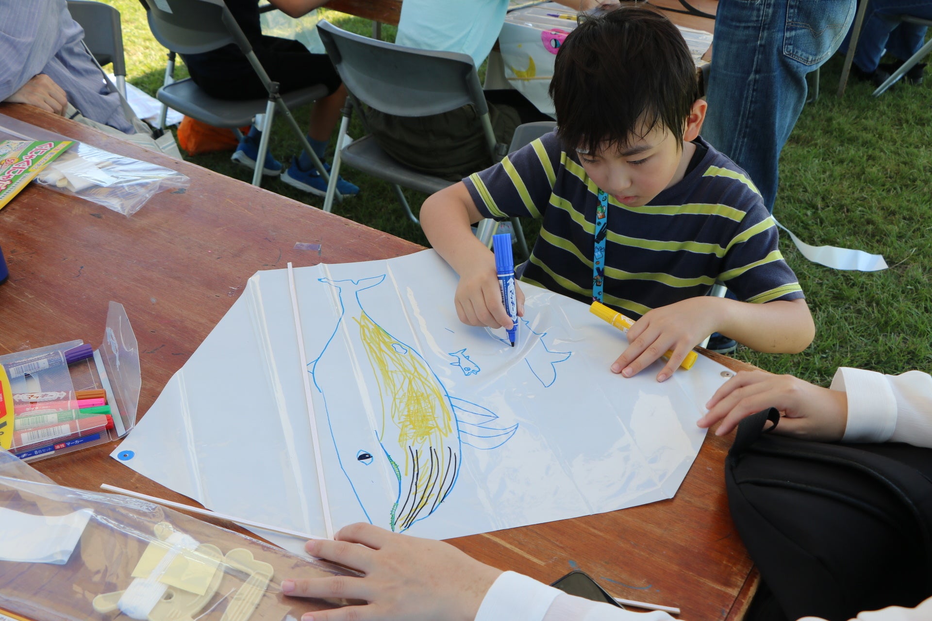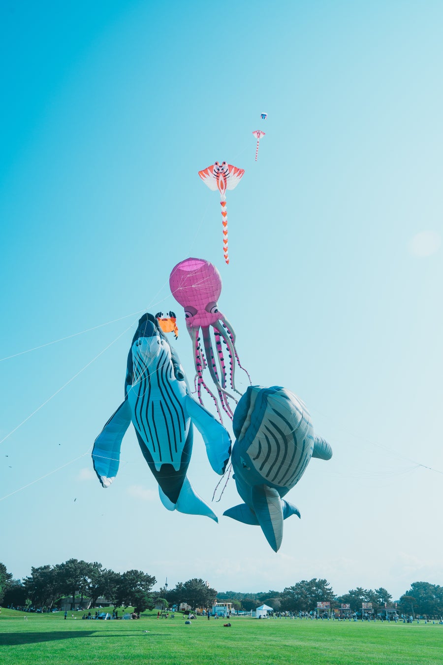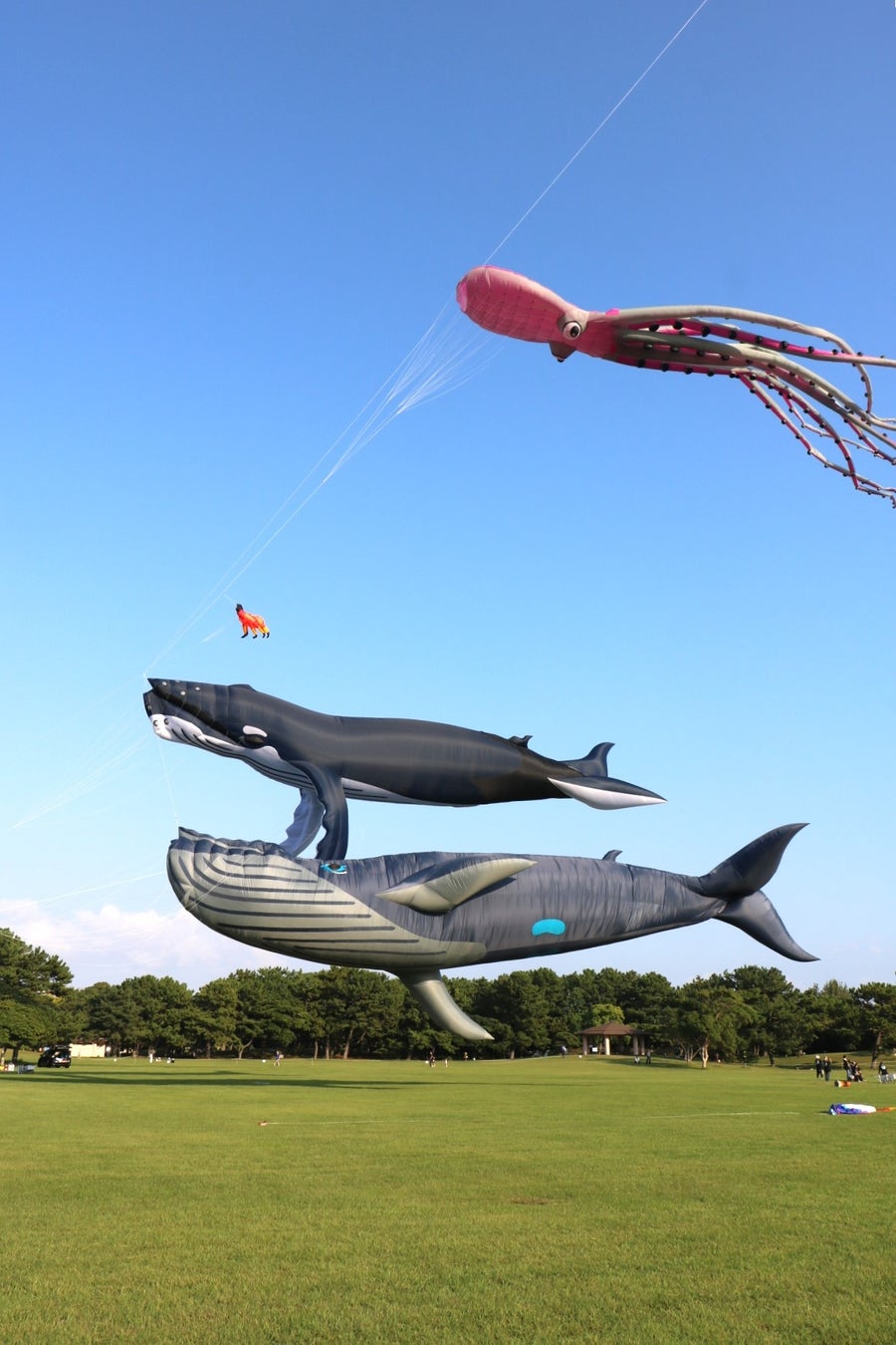 子どもが笑顔で揚げるカラフルなオリジナル凧と、巨大クジラが競演するシーンも見逃せません。
