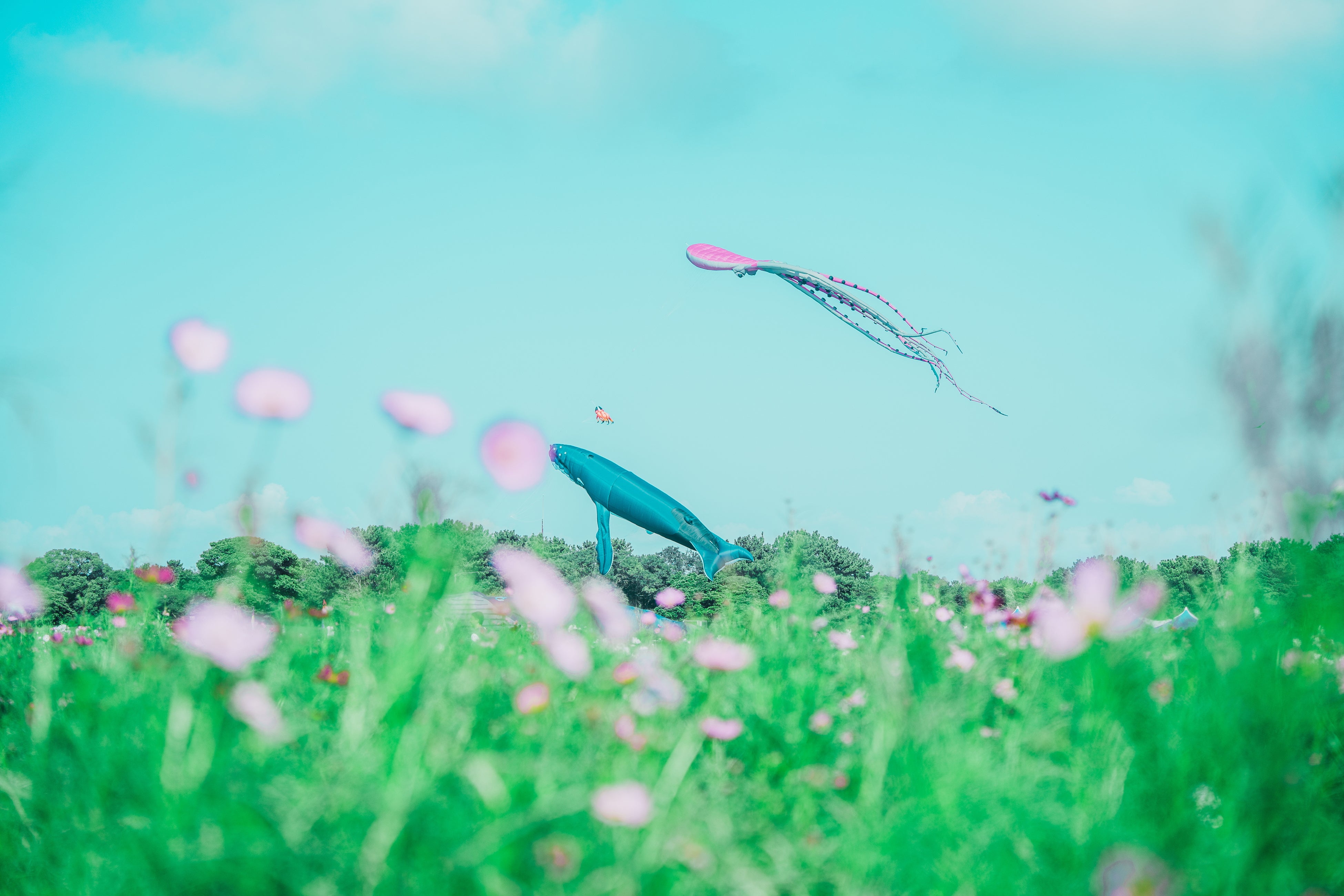 全長50mの巨大クジラをはじめ様々な形のバルーンカイトが悠然と泳ぐ光景をご覧いただけます。