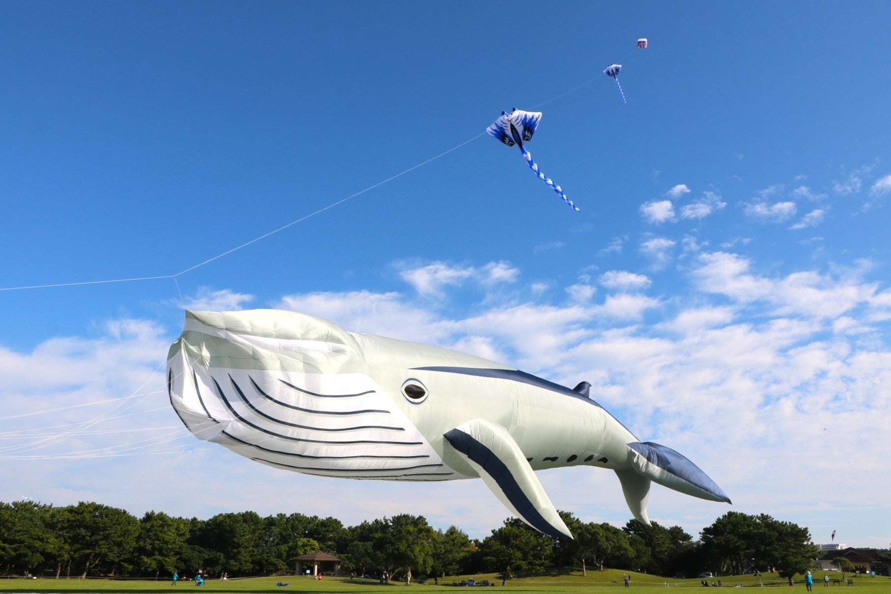 子どもが笑顔で揚げるカラフルなオリジナル凧と、巨大クジラが競演するシーンも見逃せません。